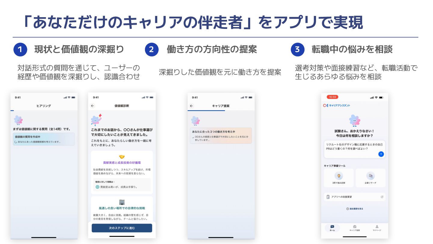 「あなただけのキャリアの伴走者」をアプリで実現 現状と価値観の深掘り 対話形式の質問を通じて、ユーザーの 経歴や価値観を深掘りし、認識合わせ 働き方の方向性の提案 深掘りした価値観を元に働き方を提案 転職中の悩みを相談 選考対策や面接練習など、転職活動で 生じるあらゆる悩みを相談 1
