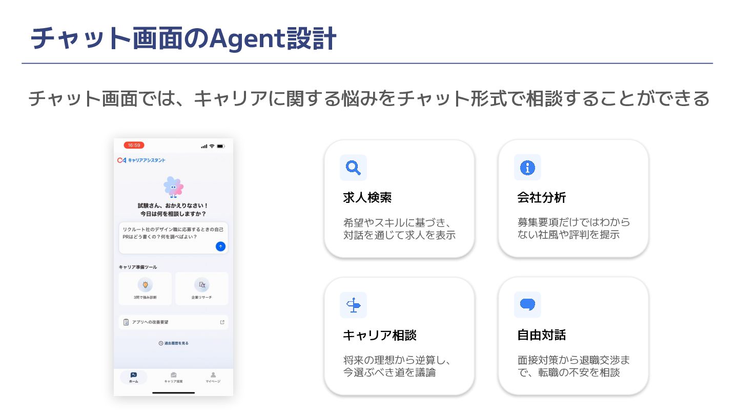チャット画面のAgent設計 チャット画面では、キャリアに関する悩みをチャット形式で相談することができる 求人検索 希望やスキルに基づき、 対話を通じて求人を表示 会社分析 募集要項だけではわから ない社風や評判を提示 キャリア相談 将来の理想から逆算し、