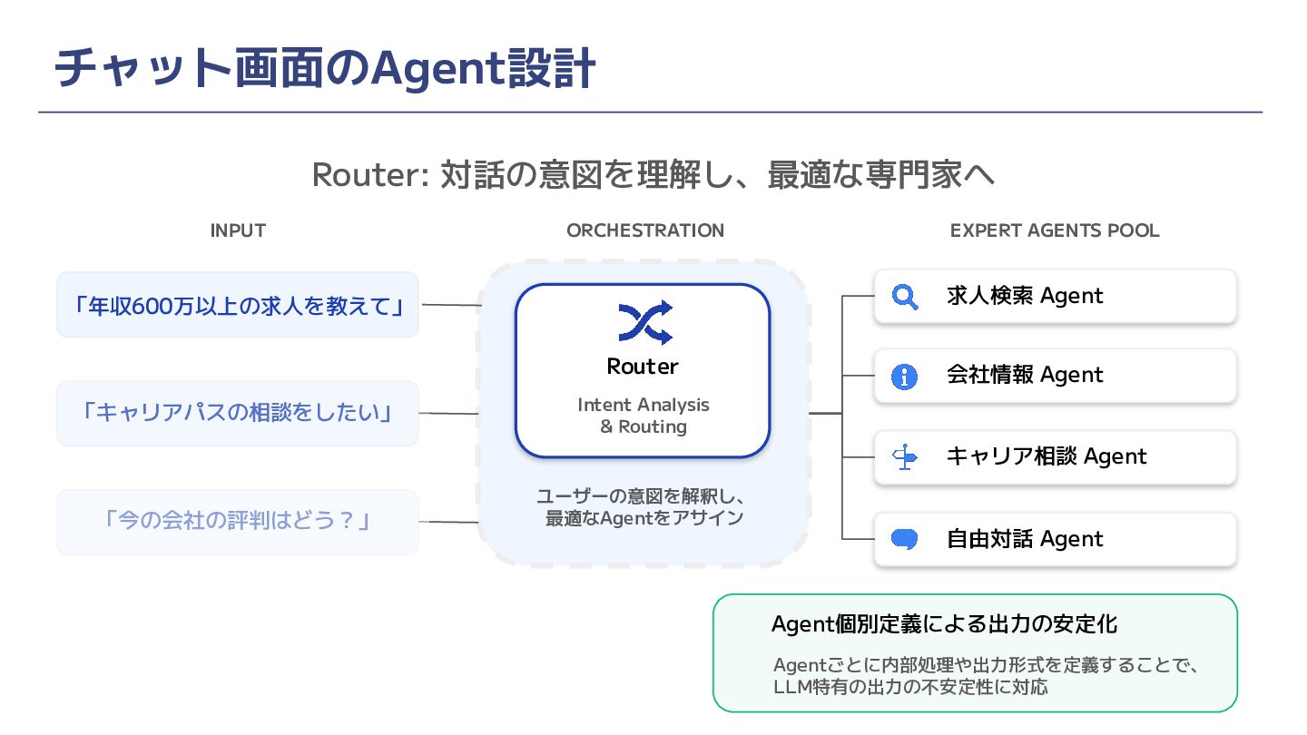 Agent 「年収600万以上の求人を教えて」 「キャリアパスの相談をしたい」 「今の会社の評判はどう?」 Router Intent Analysis & Routing ユーザーの意図を解釈し、 最適なAgentをアサイン Agent個別定義による出力の安定化 Agentごとに内部処理や出力形式を定義することで、 LLM特有の出力の不安定性に対応 INPUT ORCHESTRATION EXPERT AGENTS POOL