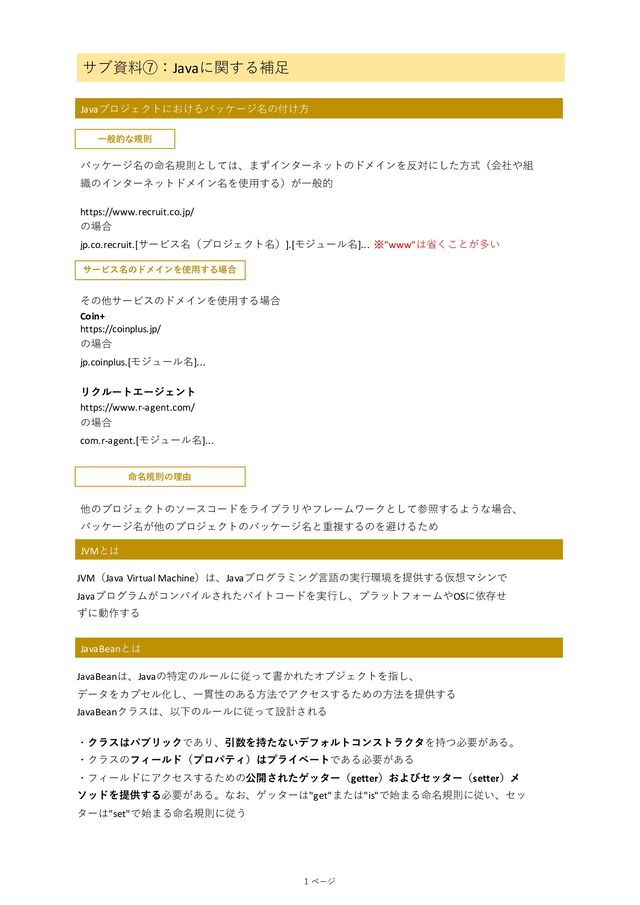 その他サービスのドメインを使⽤する場合 Coin+ https://coinplus.jp/ の場合 jp.coinplus.[モジュール名]... リクルートエージェント https://www.r-agent.com/ の場合 com.r-agent.[モジュール名]... 他のプロジェクトのソースコードをライブラリやフレームワークとして参照するような場合、 パッケージ名が他のプロジェクトのパッケージ名と重複するのを避けるため ⼀般的な規則 サービス名のドメインを使⽤する場合 命名規則の理由 JavaBeanとは JavaBeanは、Javaの特定のルールに従って書かれたオブジェクトを指し、 データをカプセル化し、⼀貫性のある⽅法でアクセスするための⽅法を提供する JavaBeanクラスは、以下のルールに従って設計される ・クラスはパブリックであり、引数を持たないデフォルトコンストラクタを持つ必要がある。 ・クラスのフィールド(プロパティ)はプライベートである必要がある ・フィールドにアクセスするための公開されたゲッター(getter)およびセッター(setter)メ ソッドを提供する必要がある。なお、ゲッターは"get"または"is"で始まる命名規則に従い、セッ ターは"set"で始まる命名規則に従う JVMとは JVM(Java Virtual Machine)は、Javaプログラミング⾔語の実⾏環境を提供する仮想マシンで Javaプログラムがコンパイルされたバイトコードを実⾏し、プラットフォームやOSに依存せ ずに動作する