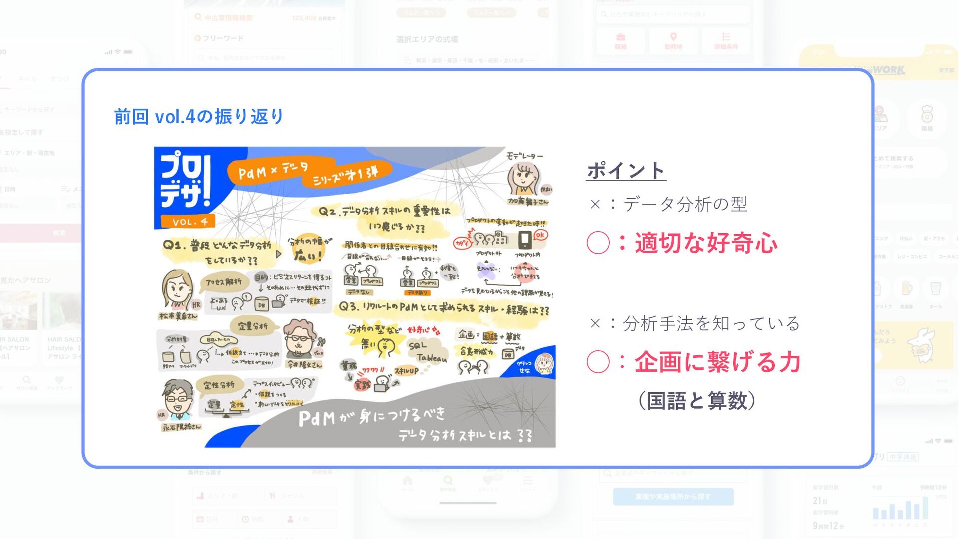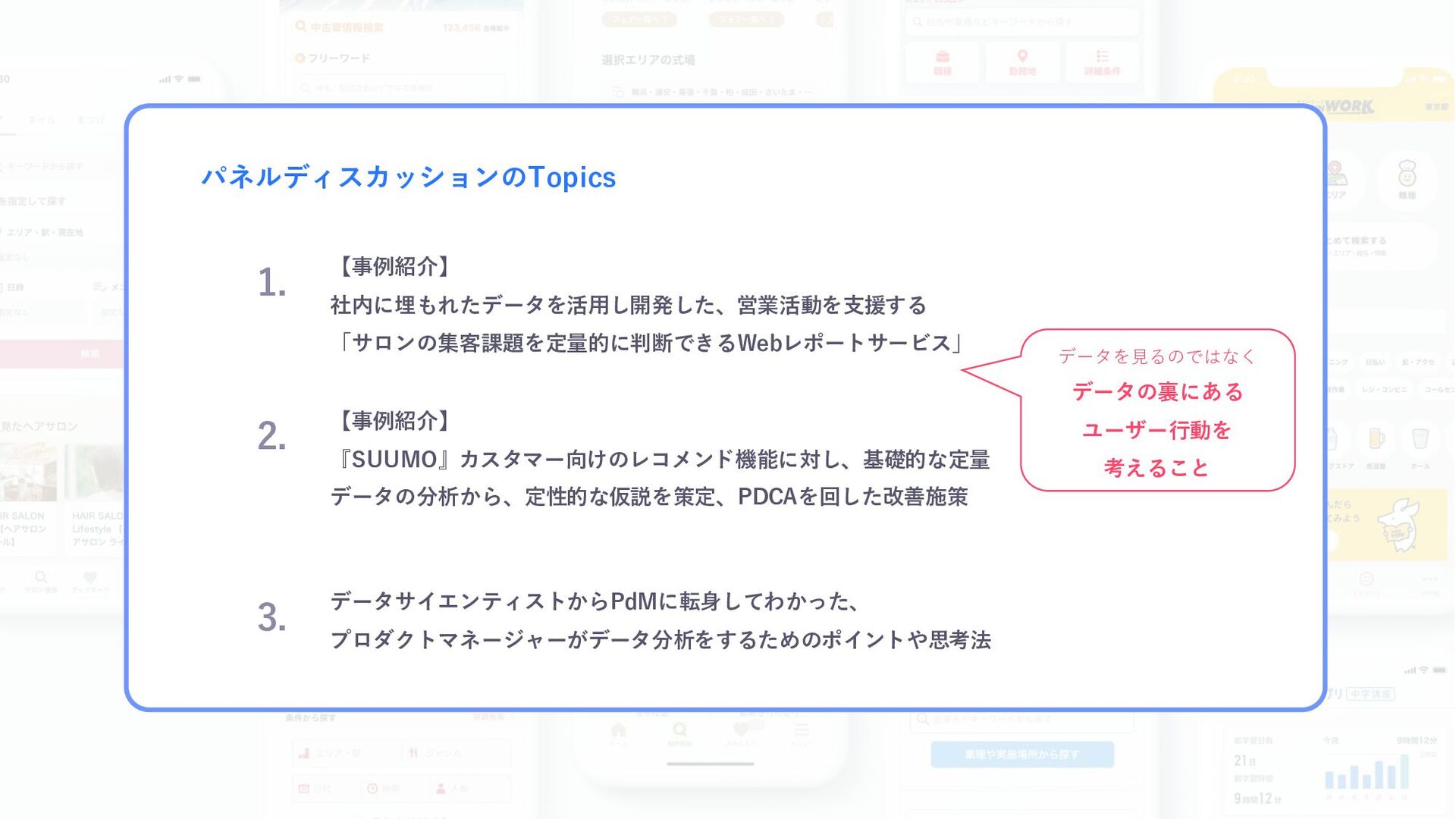 『SUUMO』カスタマー向けのレコメンド機能に対し、基礎的な定量 データの分析から、定性的な仮説を策定、PDCAを回した改善施策 データサイエンティストからPdMに転身してわかった、 プロダクトマネージャーがデータ分析をするためのポイントや思考法 2. 3. データを見るのではなく データの裏にある ユーザー行動を 考えること