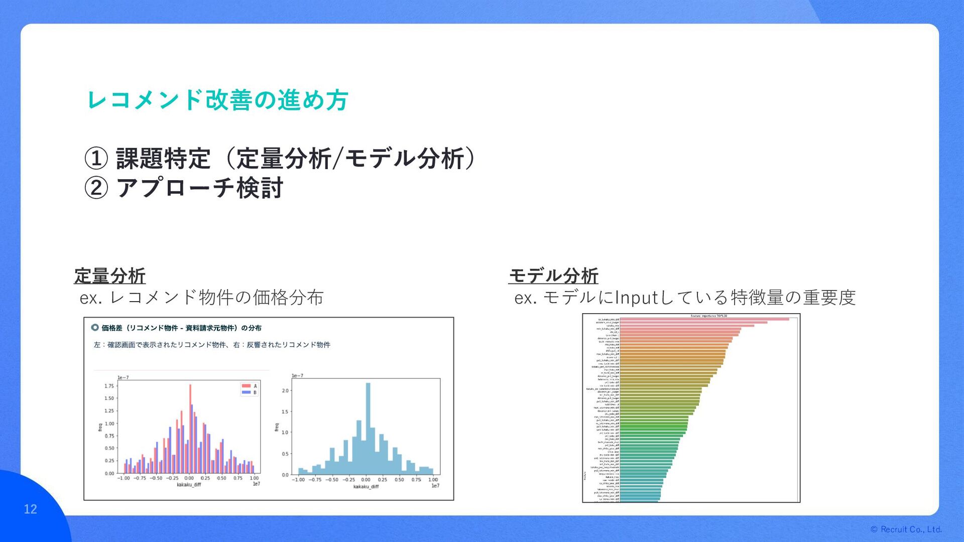© Recruit Co., Ltd. 12 レコメンド改善の進め方 ① 課題特定(定量分析/モデル分析) ② アプローチ検討