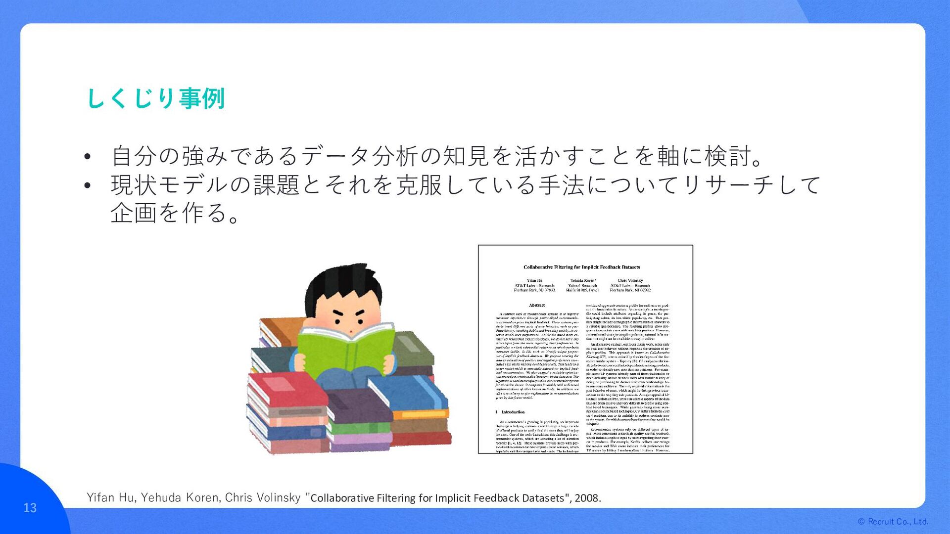 企画を作る。 Yifan Hu, Yehuda Koren, Chris Volinsky "Collaborative Filtering for Implicit Feedback Datasets", 2008. 改善が見られず敗北