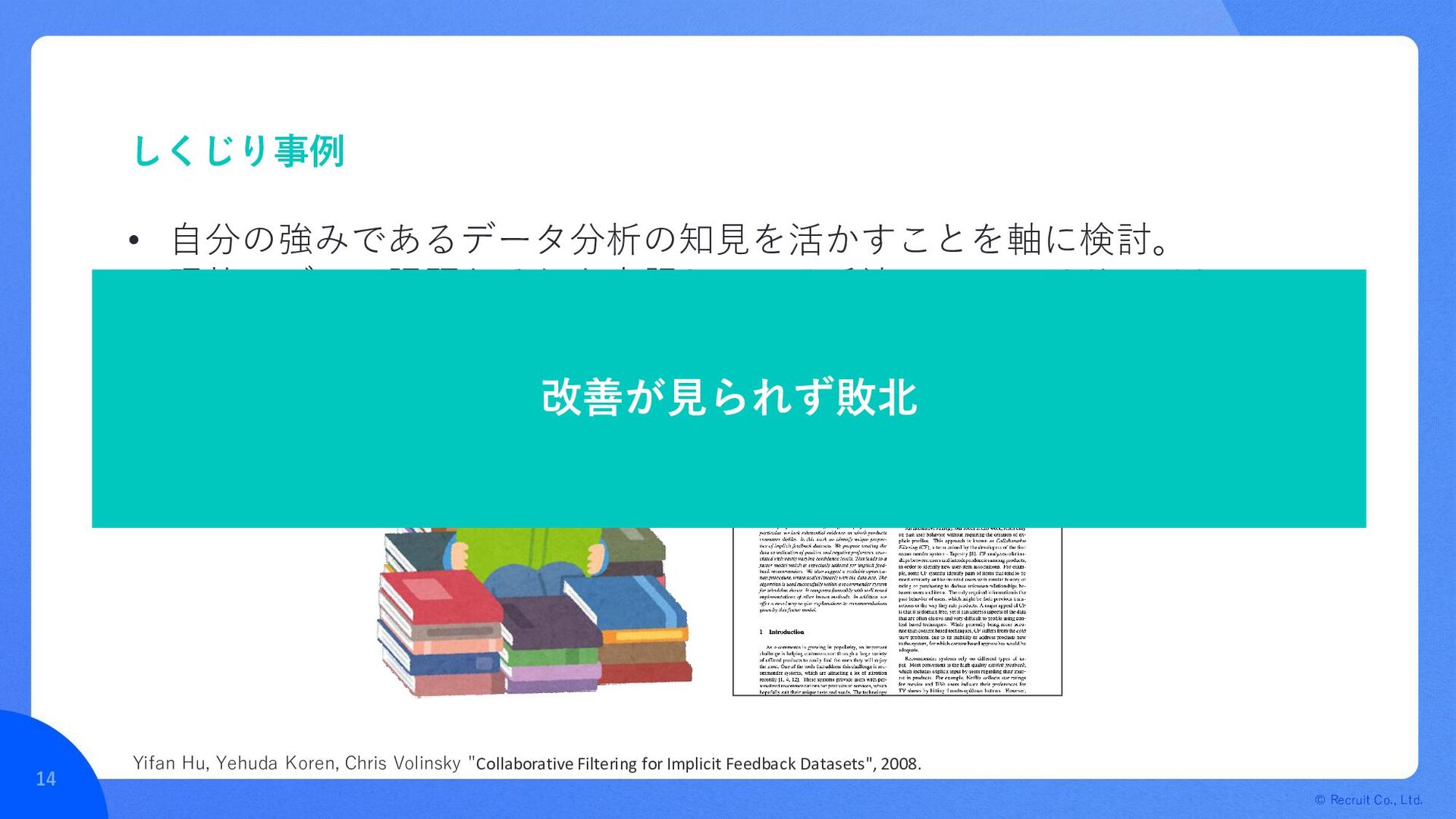 © Recruit Co., Ltd. 13 しくじり事例 • 自分の強みであるデータ分析の知見を活かすことを軸に検討。 • 現状モデルの課題とそれを克服している手法についてリサーチして