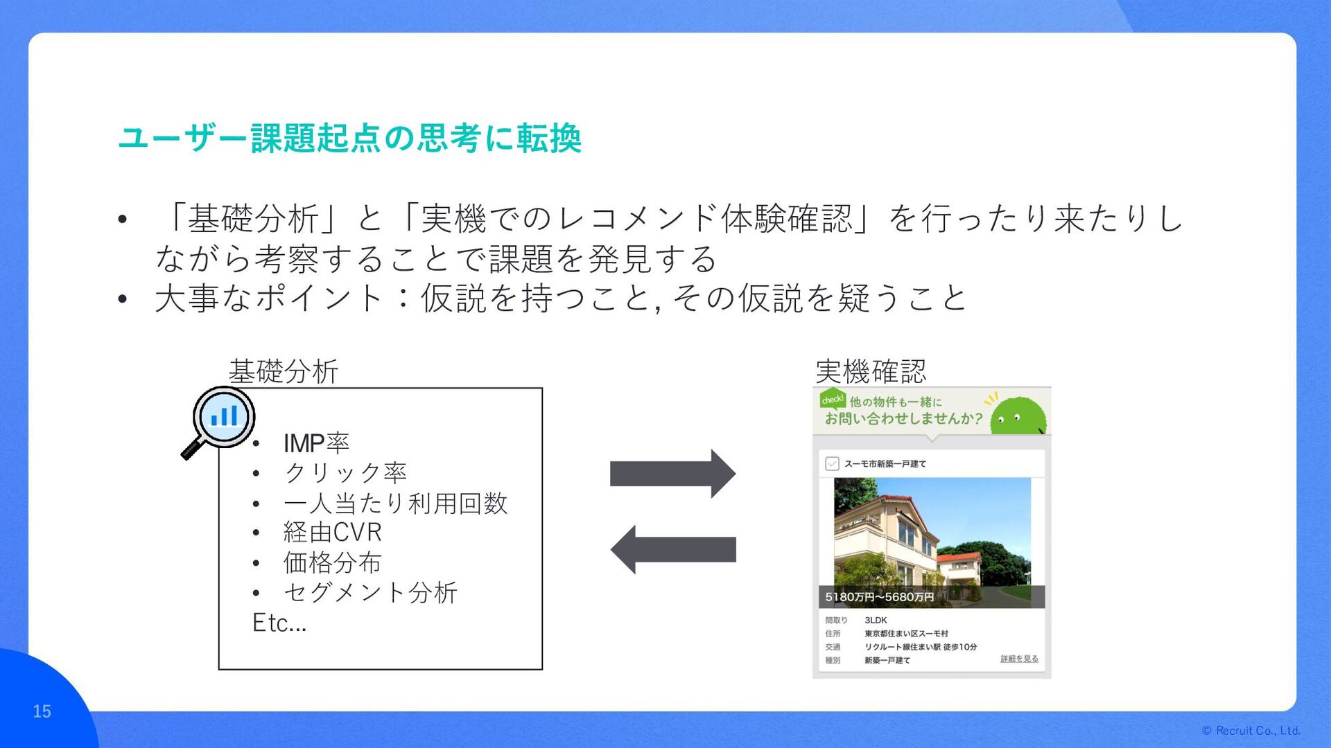 © Recruit Co., Ltd. 15 ユーザー課題起点の思考に転換 • 「基礎分析」と「実機でのレコメンド体験確認」を行ったり来たりし ながら考察することで課題を発見する •