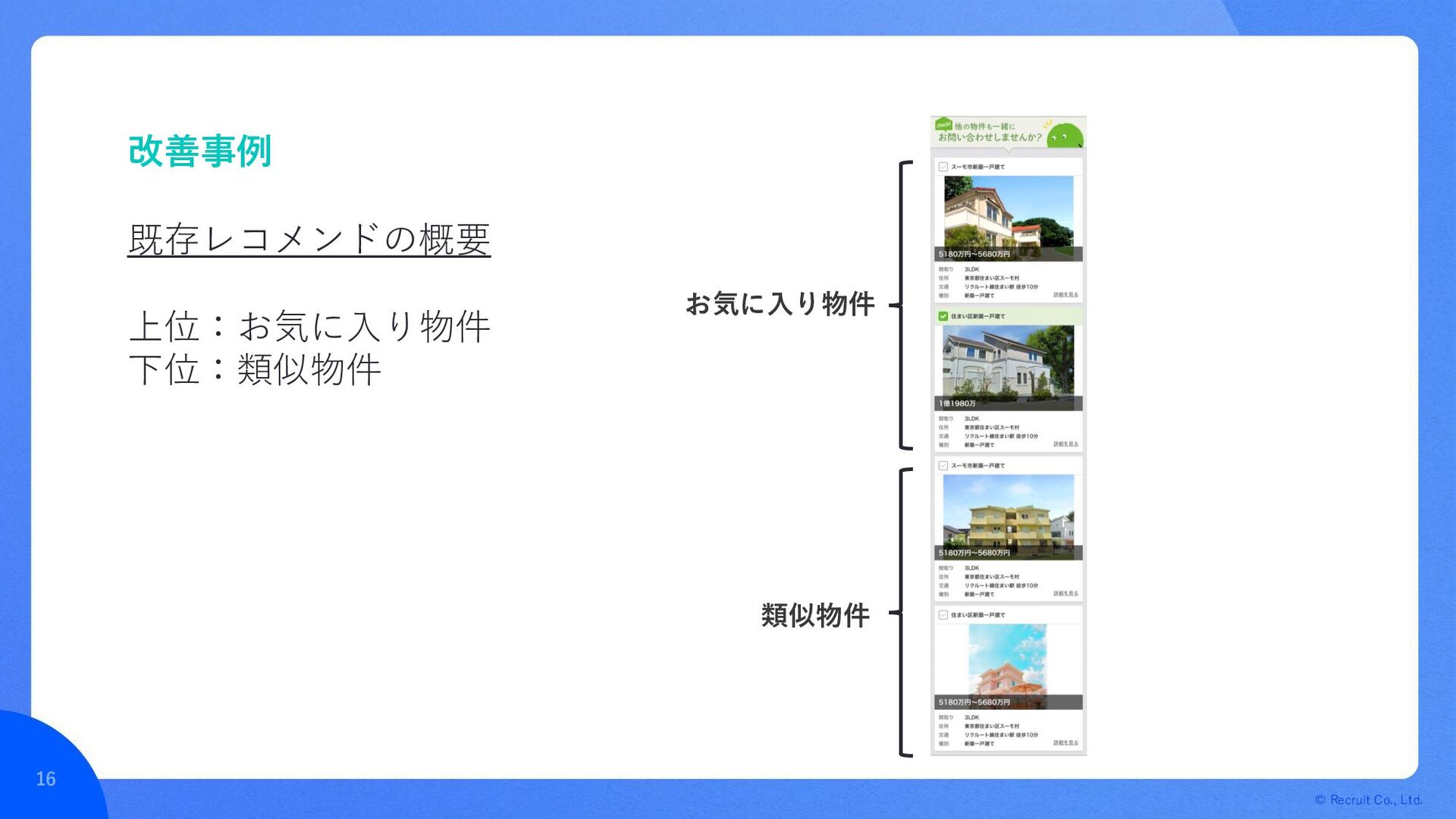 © Recruit Co., Ltd. 16 改善事例 既存レコメンドの概要 上位:お気に入り物件 下位:類似物件 お気に入り物件
