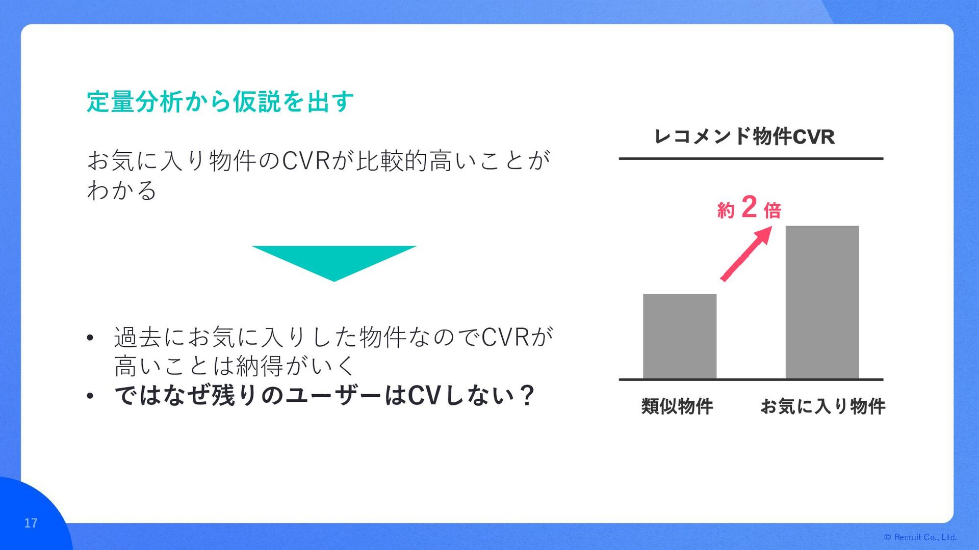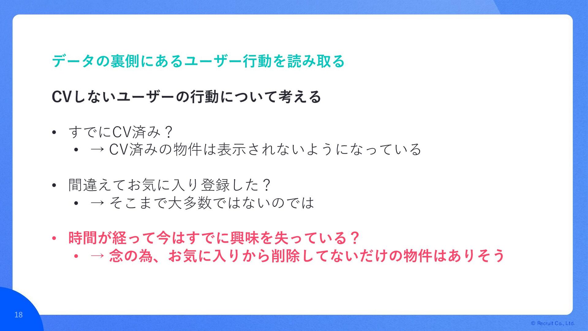© Recruit Co., Ltd. 17 定量分析から仮説を出す お気に入り物件のCVRが比較的高いことが わかる • 過去にお気に入りした物件なのでCVRが