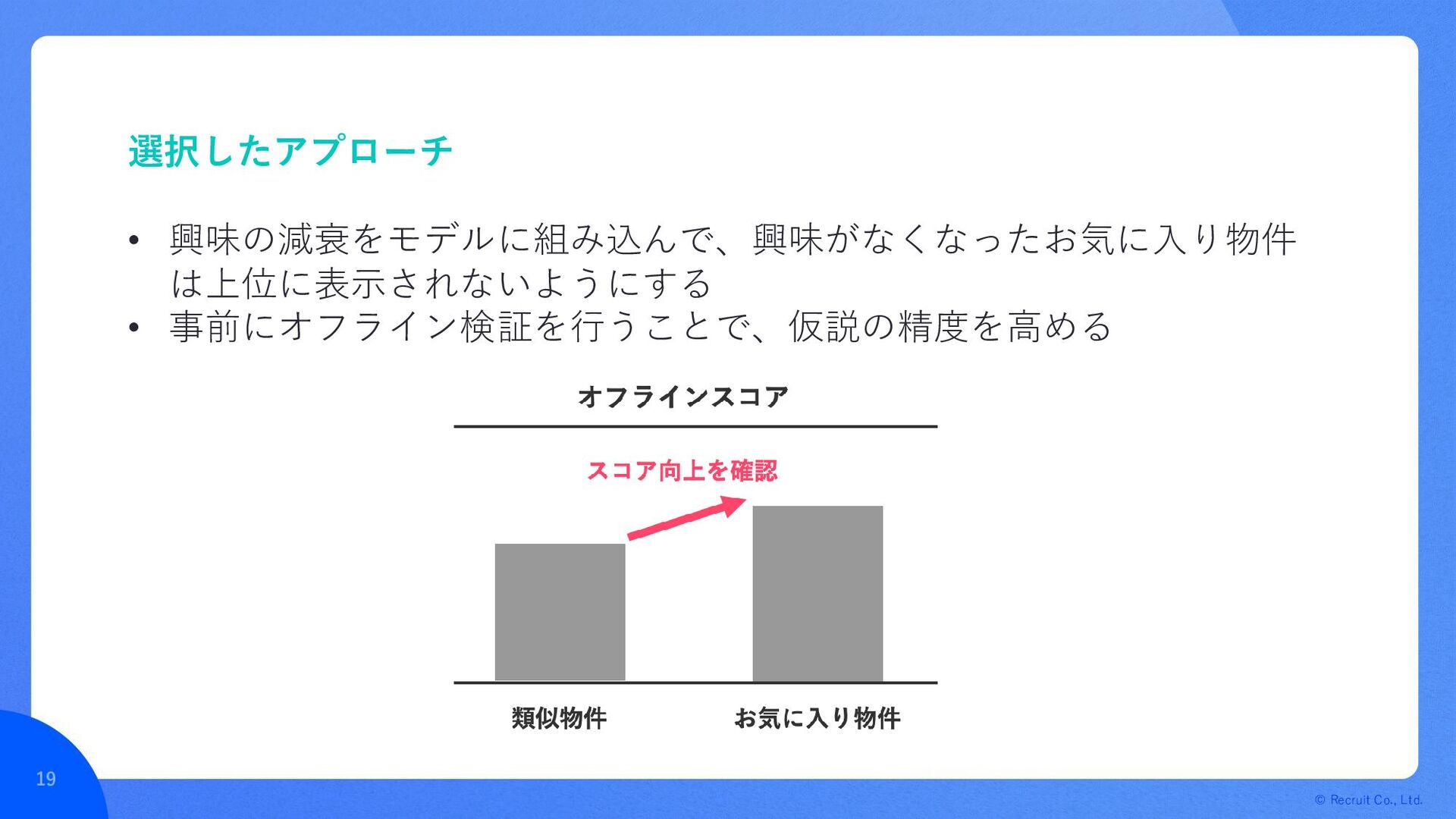 © Recruit Co., Ltd. 20 選択したアプローチ • 興味の減衰をモデルに組み込んで、興味がなくなったお気に入り物件 は上位に表示されないようにする •