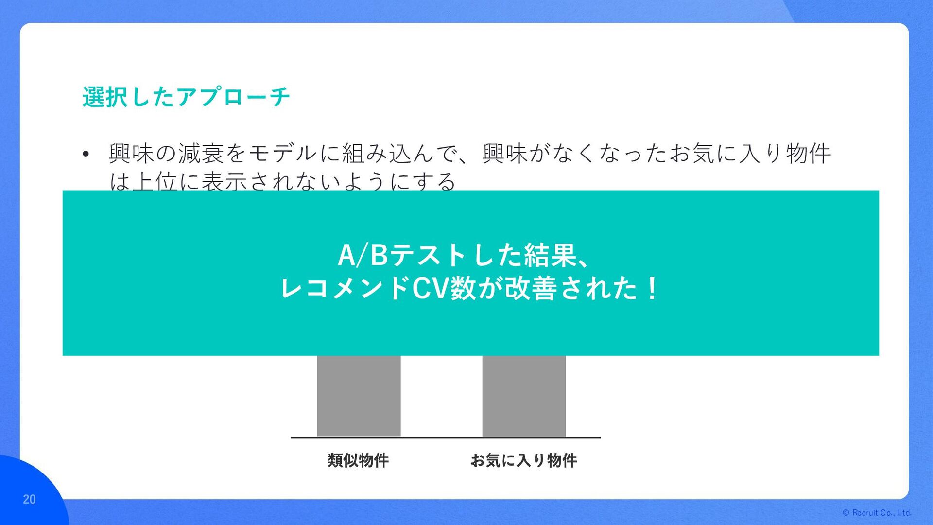 © Recruit Co., Ltd. 19 選択したアプローチ • 興味の減衰をモデルに組み込んで、興味がなくなったお気に入り物件 は上位に表示されないようにする •