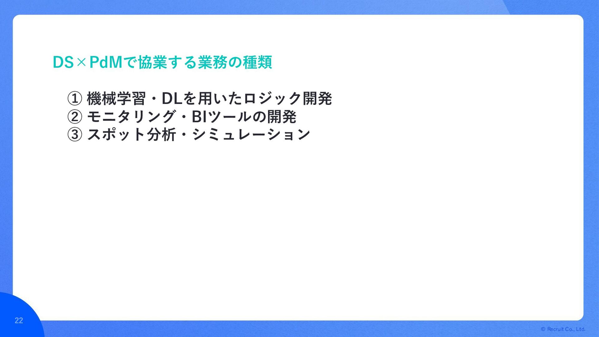 © Recruit Co., Ltd. 22 DS×PdMで協業する業務の種類 ① 機械学習・DLを用いたロジック開発 ② モニタリング・BIツールの開発