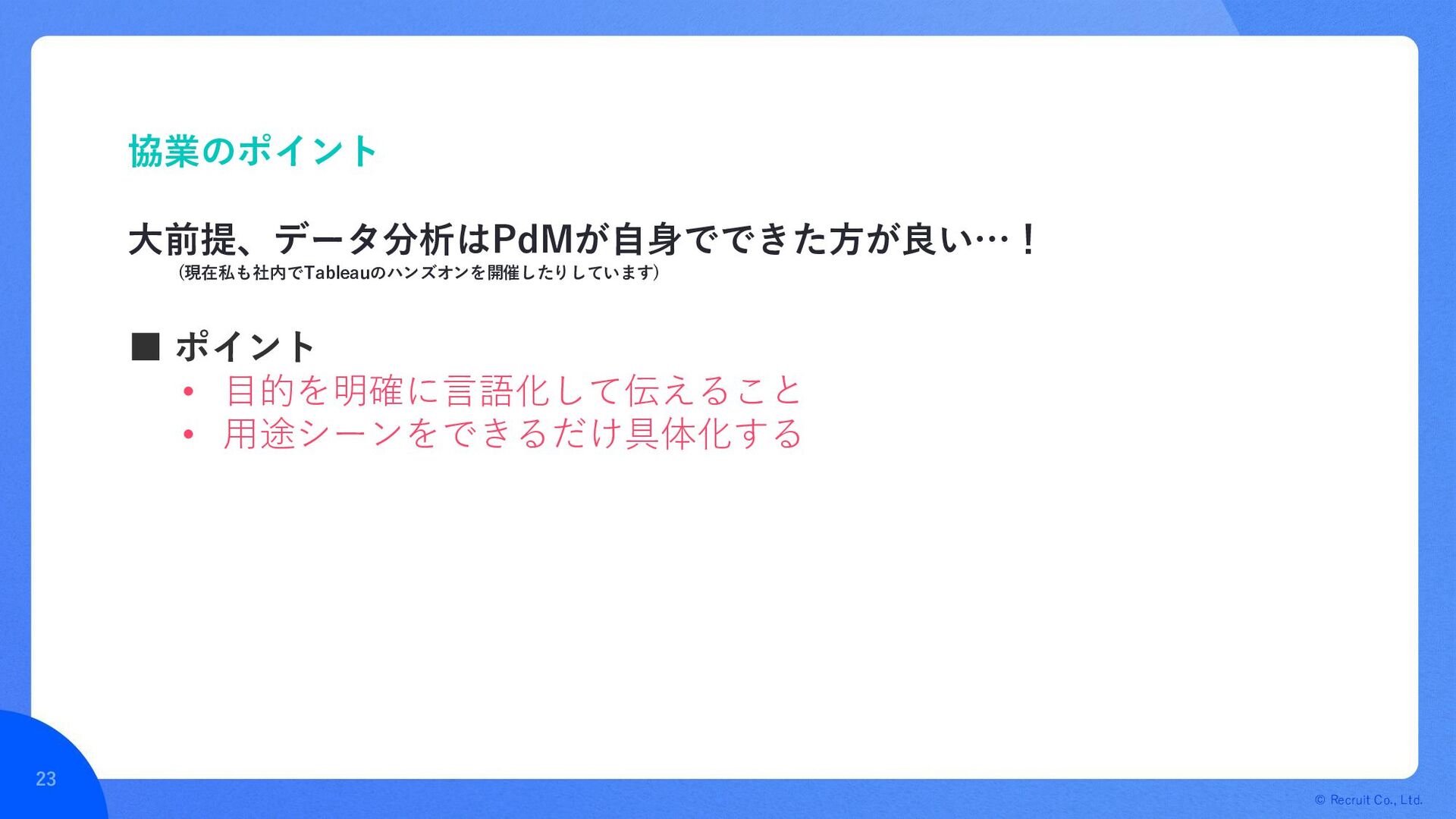 © Recruit Co., Ltd. 23 協業のポイント 大前提、データ分析はPdMが自身でできた方が良い…! (現在私も社内でTableauのハンズオンを開催したりしています) ▪ ポイント