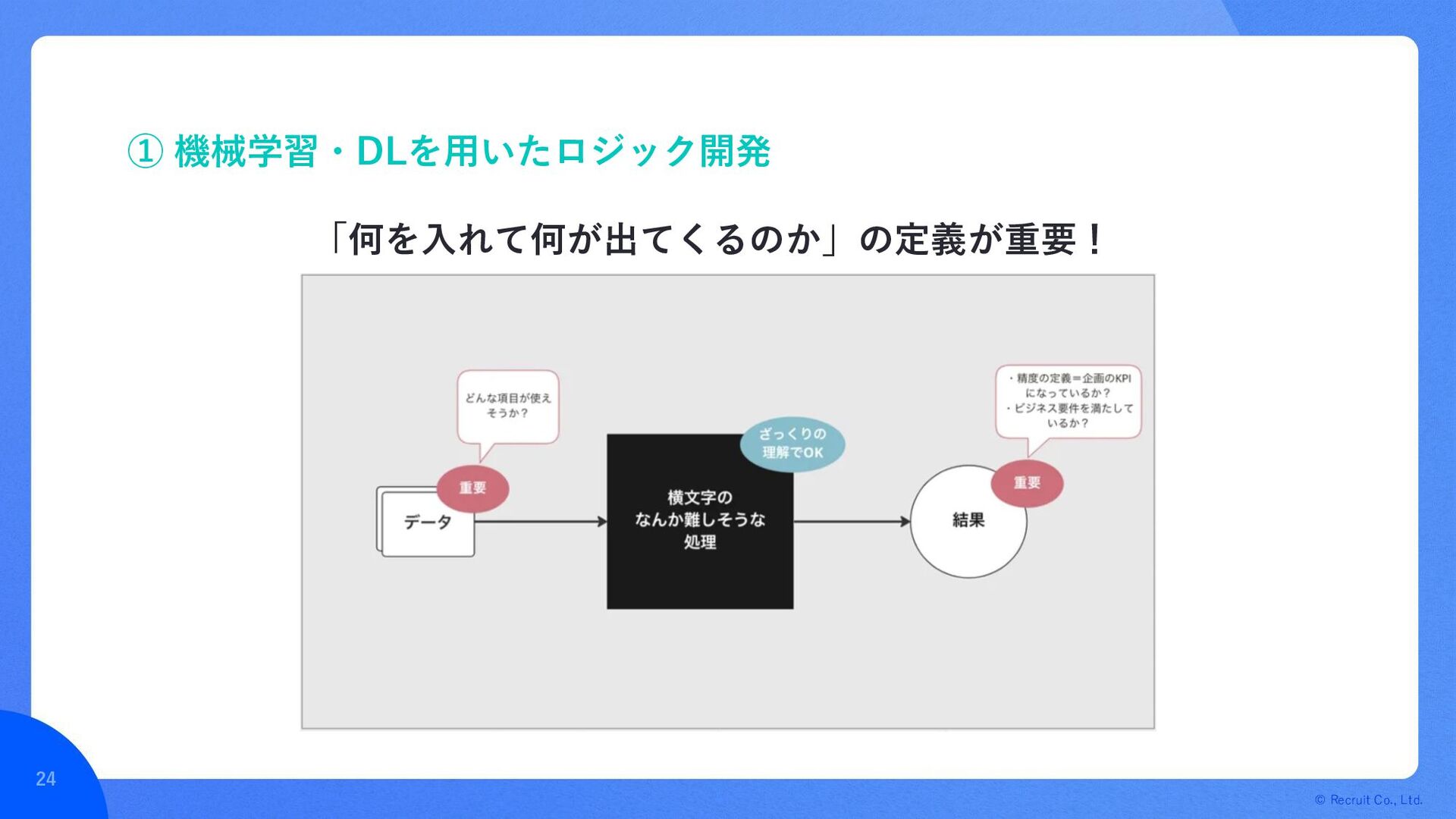 © Recruit Co., Ltd. 24 ① 機械学習・DLを用いたロジック開発 「何を入れて何が出てくるのか」の定義が重要!