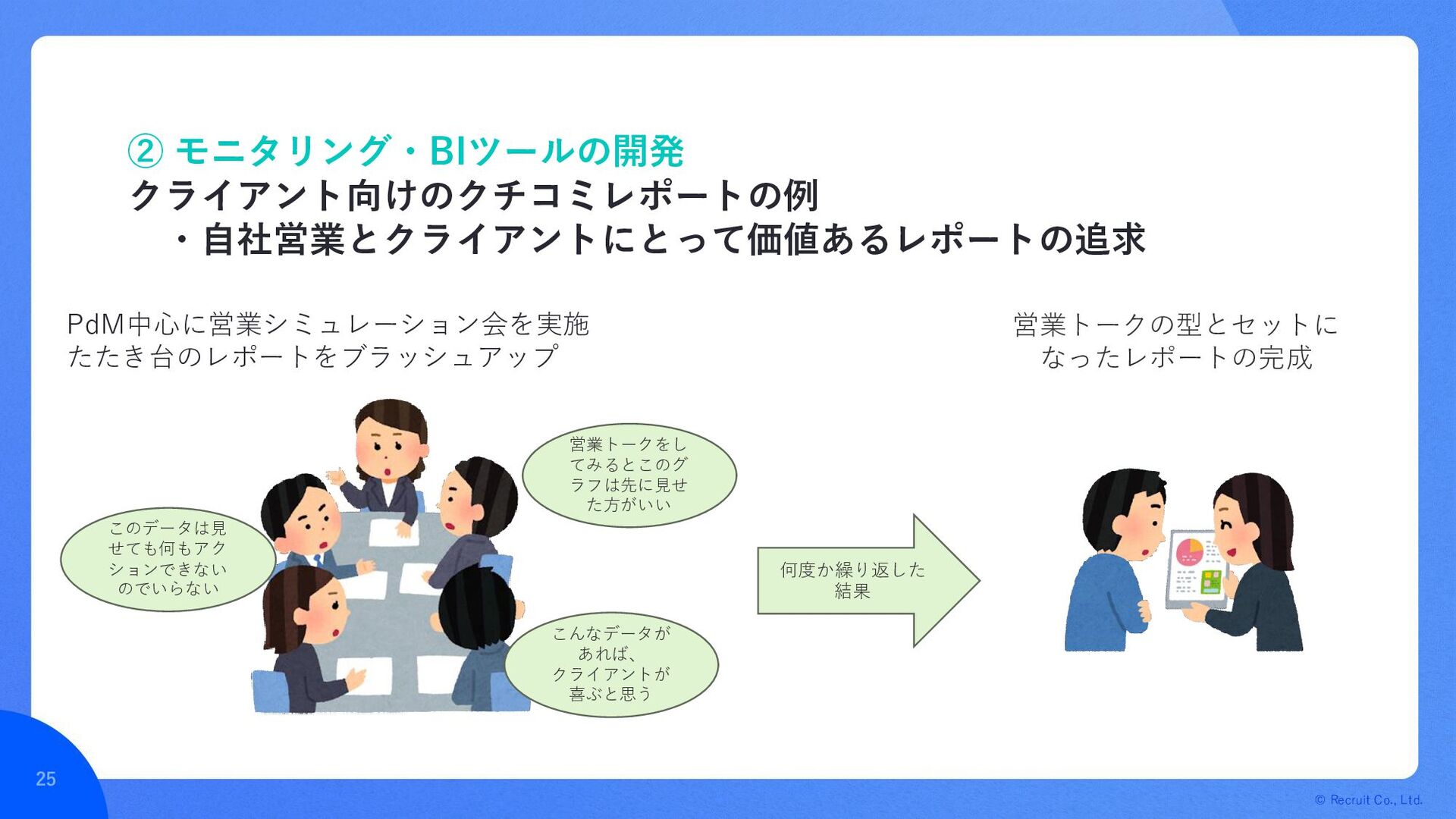 てみるとこのグ ラフは先に見せ た方がいい このデータは見 せても何もアク ションできない のでいらない こんなデータが あれば、 クライアントが 喜ぶと思う 何度か繰り返した 結果 営業トークの型とセットに なったレポートの完成 PdM中心に営業シミュレーション会を実施 たたき台のレポートをブラッシュアップ