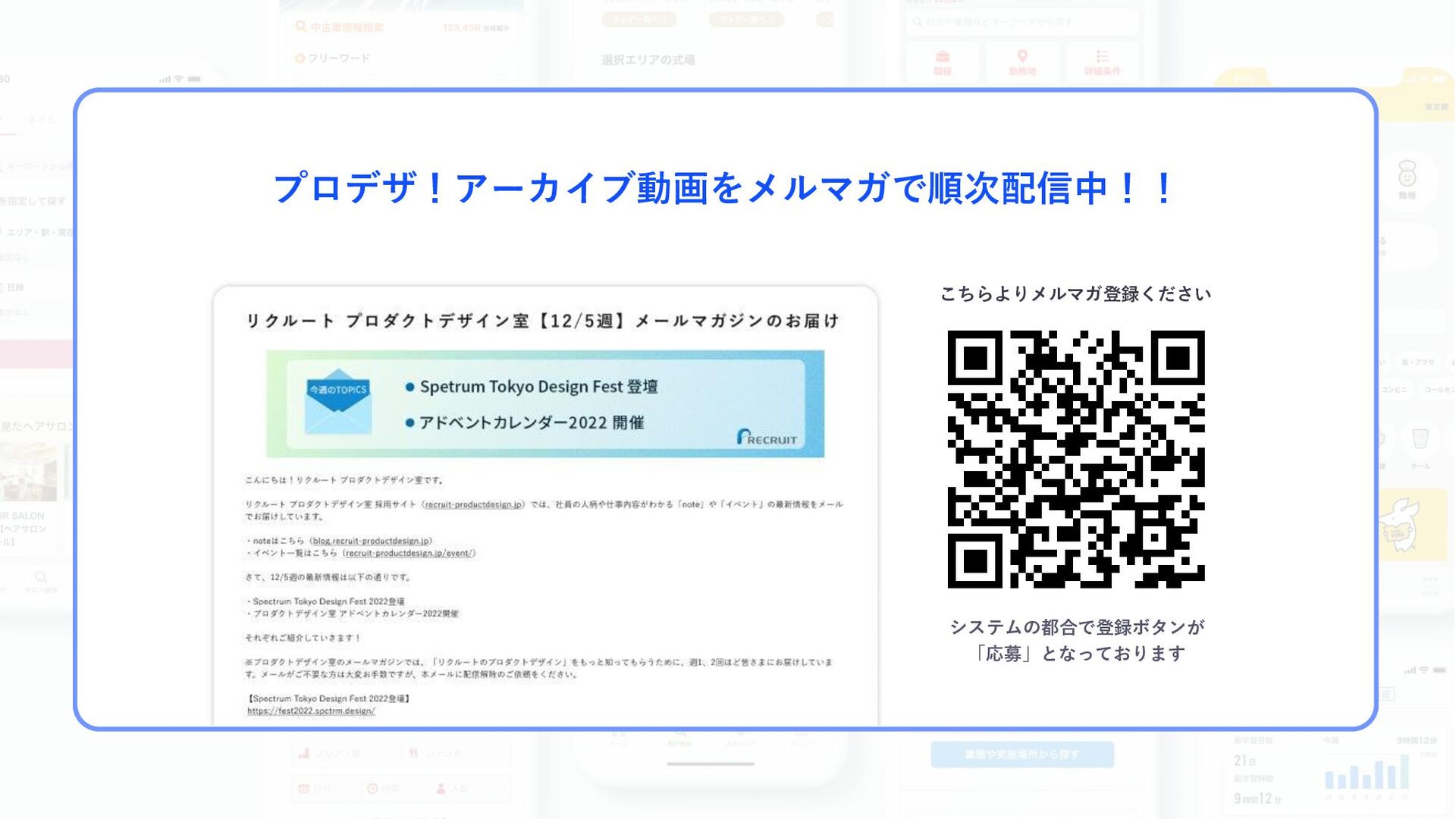 © Recruit Co., Ltd. プロデザ!アーカイブ動画をメルマガで順次配信中!! こちらよりメルマガ登録ください システムの都合で登録ボタンが 「応募」となっております
