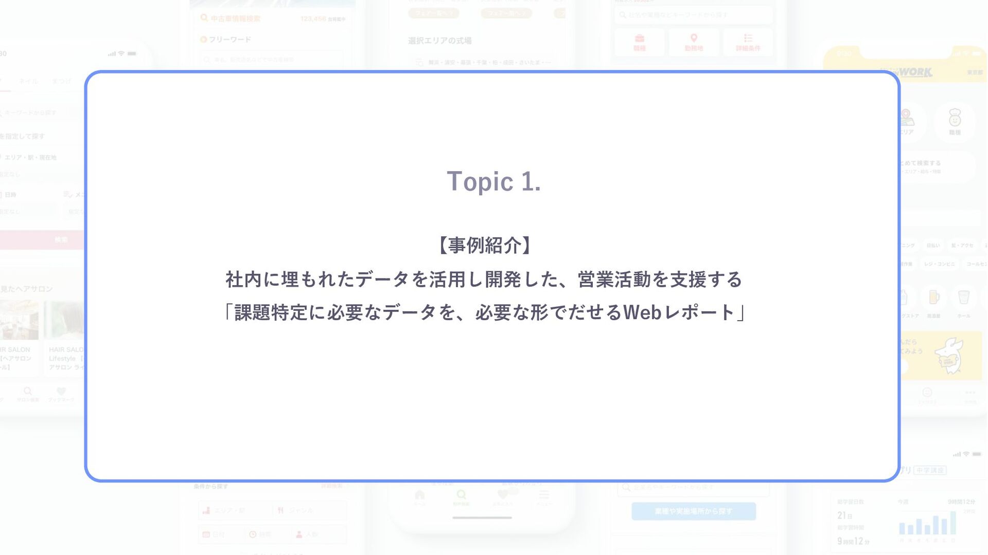 © Recruit Co., Ltd. Topic 1. 【事例紹介】 社内に埋もれたデータを活用し開発した、営業活動を支援する 「課題特定に必要なデータを、必要な形でだせるWebレポート」