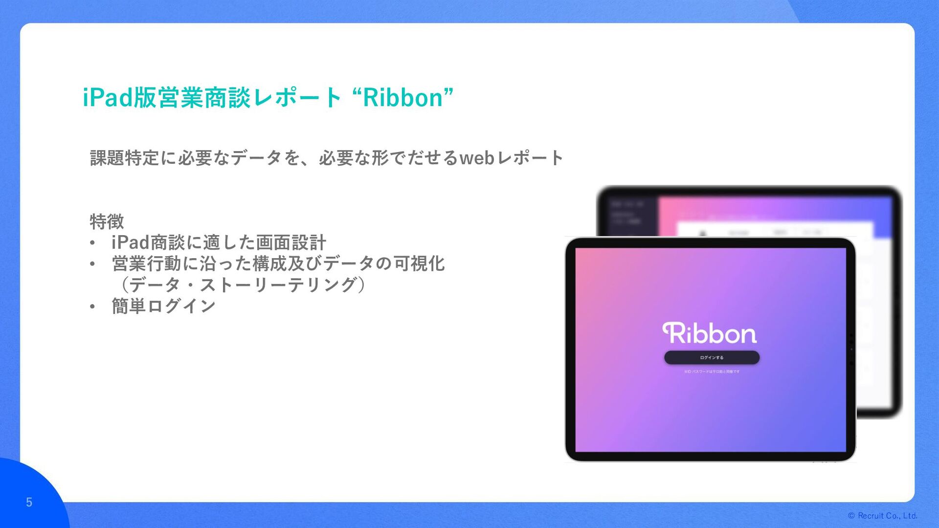 © Recruit Co., Ltd. 5 iPad版営業商談レポート “Ribbon” 課題特定に必要なデータを、必要な形でだせるwebレポート 特徴 •