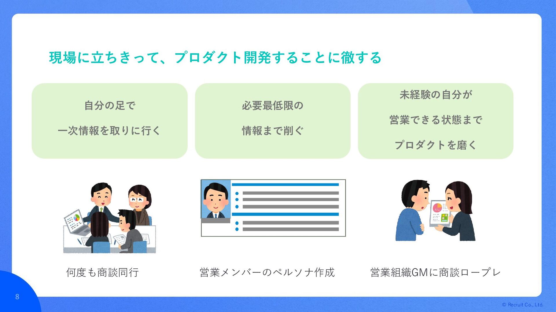 © Recruit Co., Ltd. 8 現場に立ちきって、プロダクト開発することに徹する 自分の足で 一次情報を取りに行く 必要最低限の 情報まで削ぐ