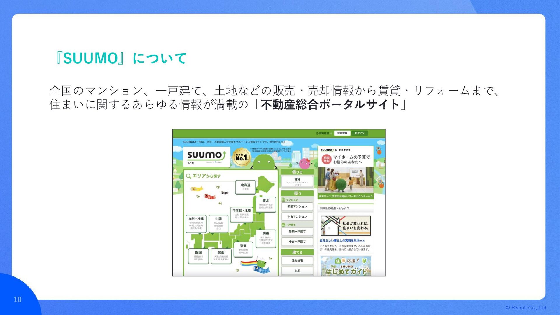© Recruit Co., Ltd. 10 『SUUMO』について 全国のマンション、一戸建て、土地などの販売・売却情報から賃貸・リフォームまで、 住まいに関するあらゆる情報が満載の「不動産総合ポータルサイト」