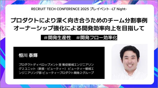 RECRUIT TECH CONFERENCE 2025 プレイベント -LT Night- #開発生産性、#開発フロー効率化 プロダクトにより深く向き合うためのチーム分割事例 オーナーシップ強化による開発効率向上を目指して