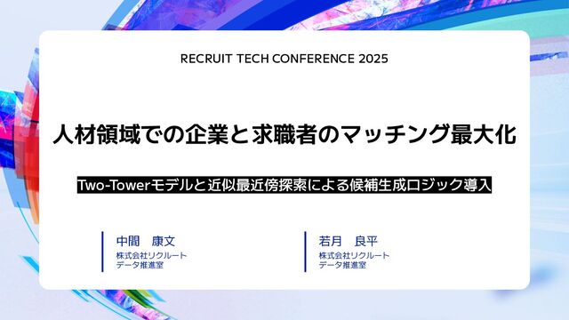 人材領域での企業と求職者のマッチング最大化 RECRUIT TECH CONFERENCE 2025 Two-Towerモデルと近似最近傍探索による候補生成ロジック導入 中間 康文 株式会社リクルート データ推進室 若月 良平