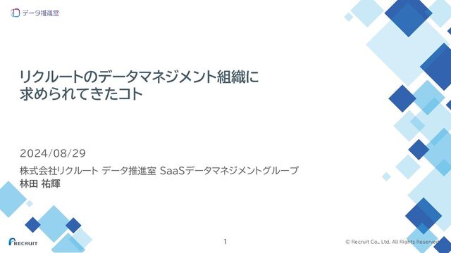 SaaSデータマネジメントグループ 林田 祐輝 2024/08/29 リクルートのデータマネジメント組織に 求められてきたコト