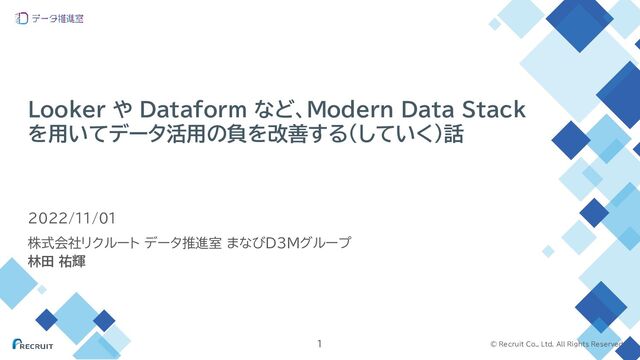 など、Modern Data Stack を用いてデータ活用の負を改善する(していく)話 1 株式会社リクルート データ推進室 まなびD3Mグループ 林田 祐輝 2022/11/01