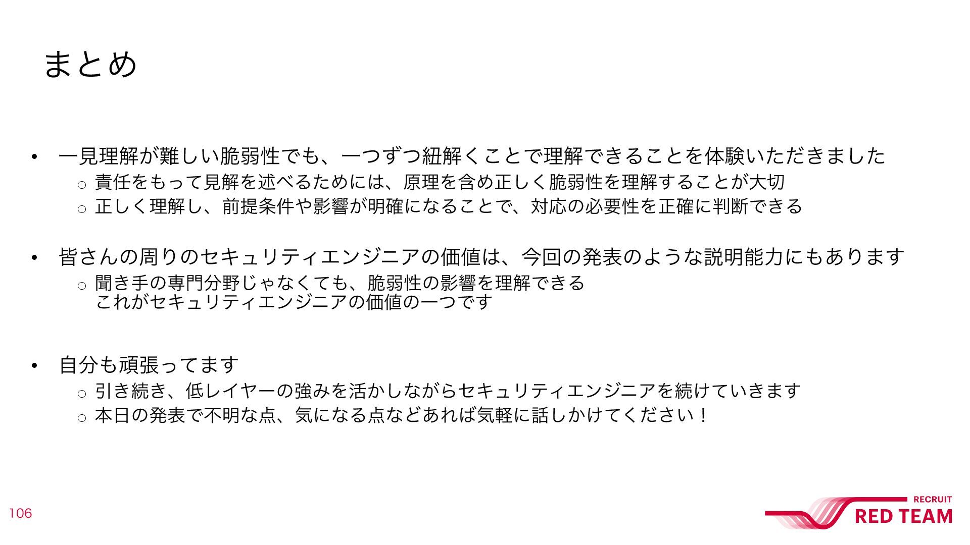 ฉ͖खͷઐ͡Όͳͯ͘ɺ੬ऑੑͷӨڹΛཧղͰ͖Δ ͜Ε͕ηΩϡϦςΟΤϯδχΞͷՁͷҰͭͰ͢ • ࣗؤுͬͯ·͢ o Ҿ͖ଓ͖ɺϨΠϠʔͷڧΈΛ׆͔͠ͳ͕ΒηΩϡϦςΟΤϯδχΞΛଓ͚͍͖ͯ·͢ o ຊͷൃදͰෆ໌ͳɺؾʹͳΔͳͲ͋Εؾܰʹ͔͚͍ͯͩ͘͠͞ʂ ·ͱΊ