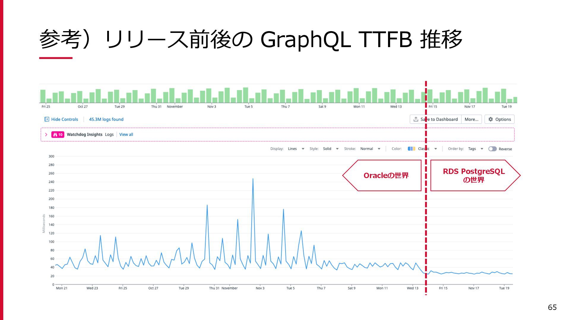 46. Oracle → RDS PostgreSQL 移⾏による成果 63 インフラコスト削減だけでなく、サイト全体のパフォーマンスも向上 移⾏前よりも2倍以上捌けるデータベースにパワーアップした ü Oracle