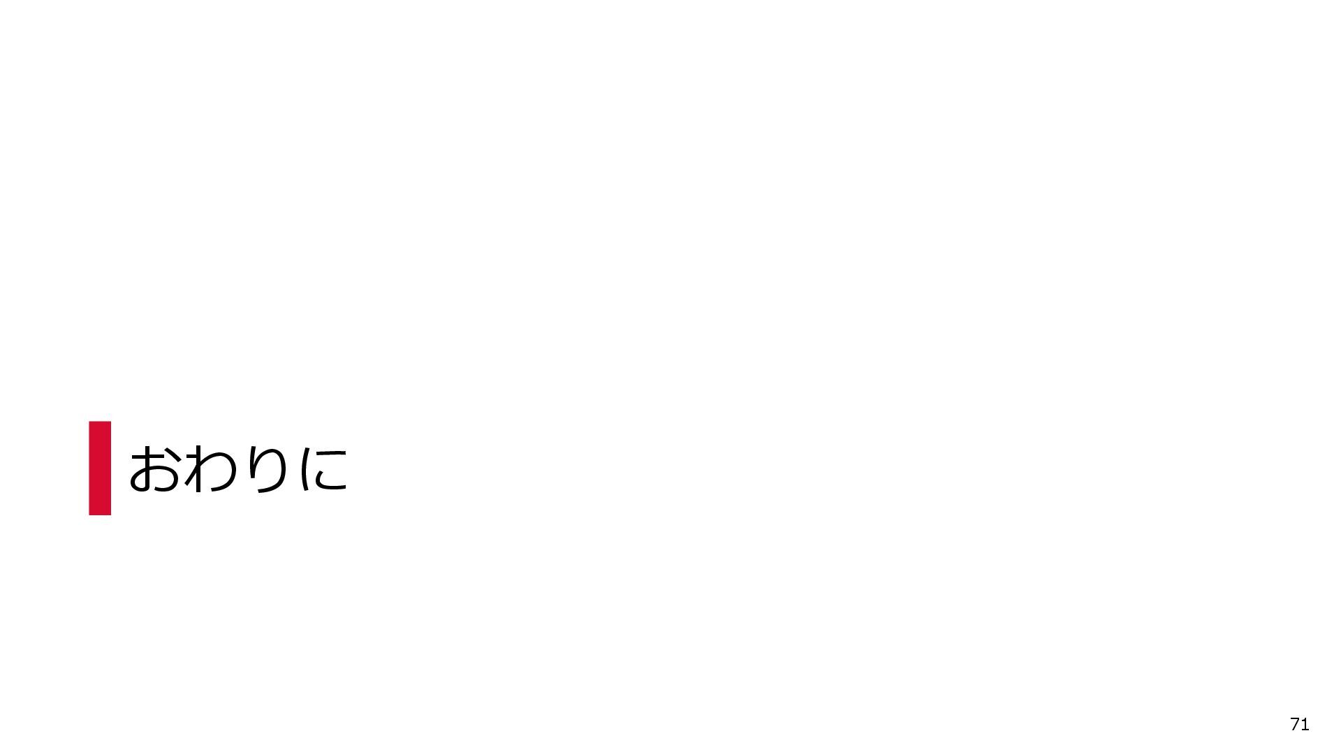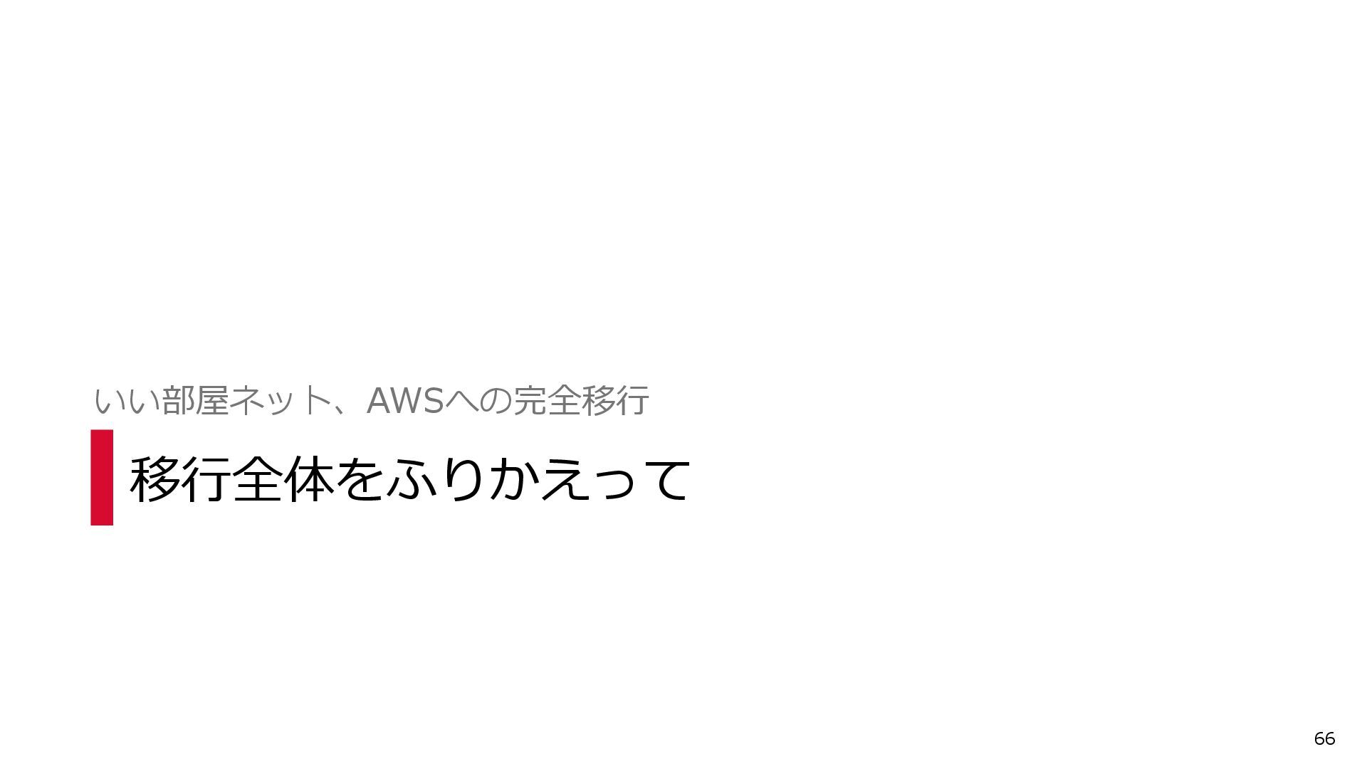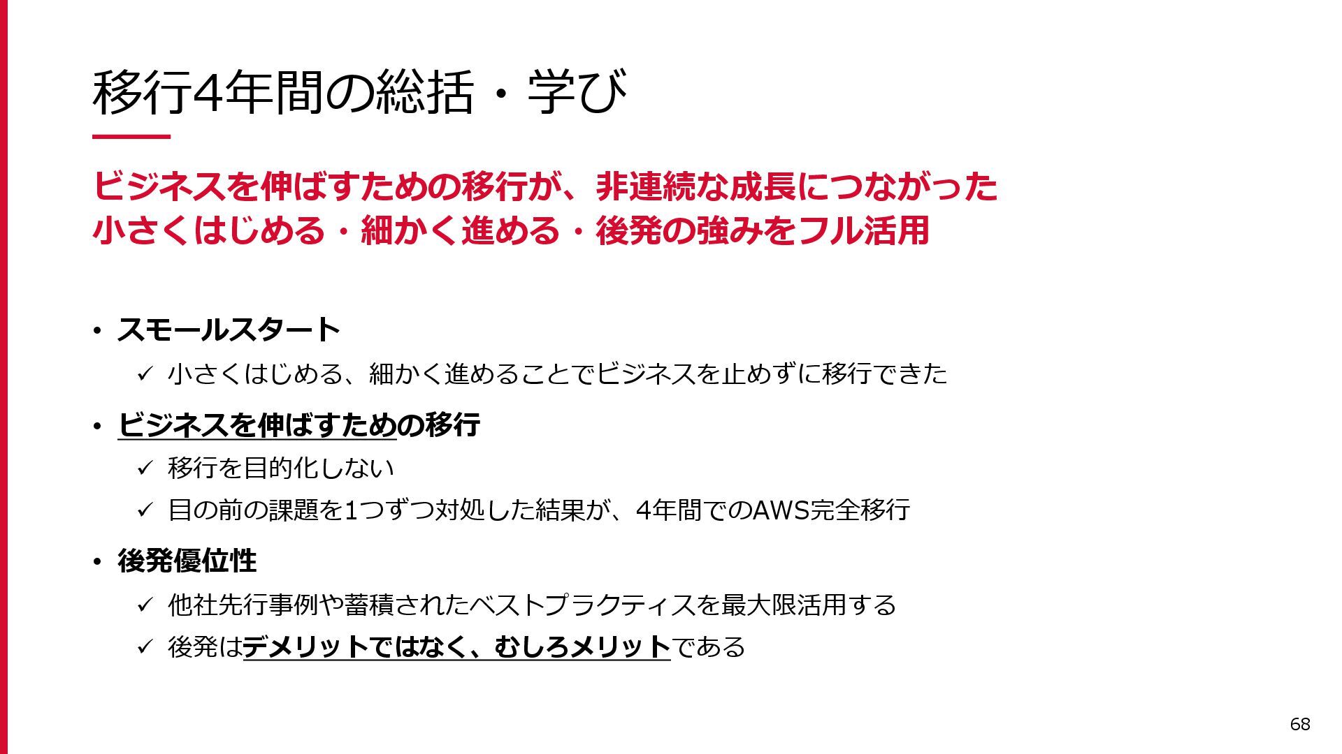 ⽬の前の課題を1つずつ対処した結果が、4年間でのAWS完全移⾏ • 後発優位性 ü 他社先⾏事例や蓄積されたベストプラクティスを最⼤限活⽤する ü 後発はデメリットではなく、むしろメリットである 68 ビジネスを伸ばすための移⾏が、⾮連続な成⻑につながった ⼩さくはじめる・細かく進める・後発の強みをフル活⽤