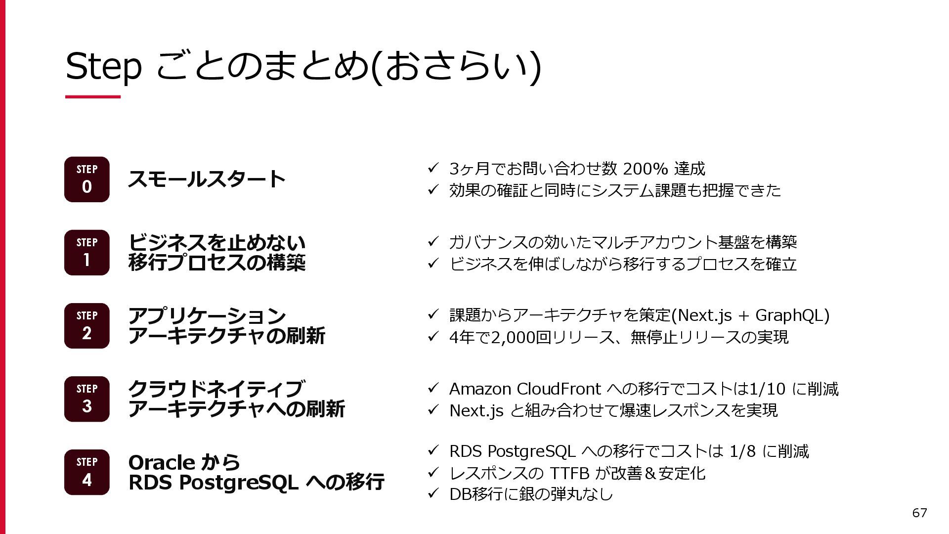 STEP 0 ビジネスを⽌めない 移⾏プロセスの構築 ü ガバナンスの効いたマルチアカウント基盤を構築 ü ビジネスを伸ばしながら移⾏するプロセスを確⽴ STEP 1 アプリケーション アーキテクチャの刷新 ü 課題からアーキテクチャを策定(Next.js + GraphQL) ü 4年で2,000回リリース、無停⽌リリースの実現 STEP 2 クラウドネイティブ アーキテクチャへの刷新 ü Amazon CloudFront への移⾏でコストは1/10 に削減 ü Next.js と組み合わせて爆速レスポンスを実現 STEP 3 Oracle から RDS PostgreSQL への移⾏ ü RDS PostgreSQL への移⾏でコストは 1/8 に削減 ü レスポンスの TTFB が改善&安定化 ü DB移⾏に銀の弾丸なし STEP 4