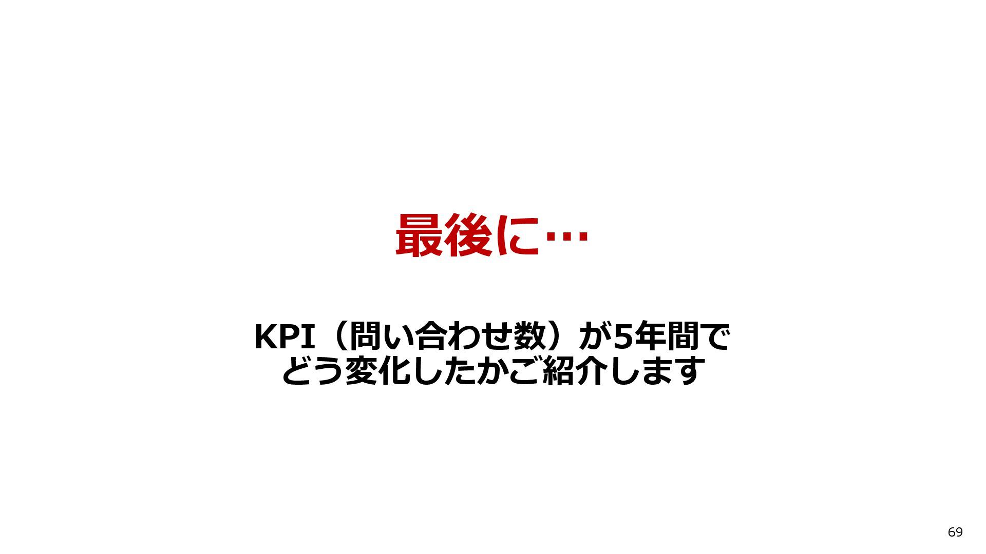 48. Step ごとのまとめ(おさらい) 67 スモールスタート ü 3ヶ⽉でお問い合わせ数 200% 達成 ü 効果の確証と同時にシステム課題も把握できた