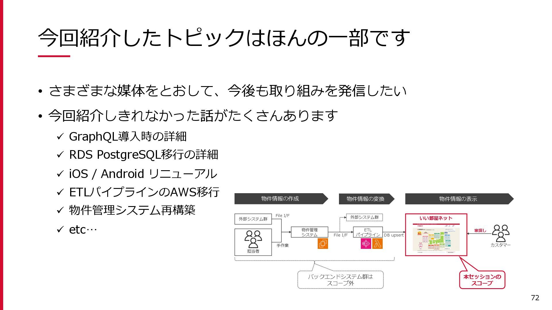 ü iOS / Android リニューアル ü ETLパイプラインのAWS移⾏ ü 物件管理システム再構築 ü etc… 72 物件情報の作成 物件情報の変換 物件情報の表⽰ 外部システム群 担当者 物件管理 システム ETL パイプライン 外部システム群 File I/F File I/F カスタマー いい部屋ネット 家探し DB upsert 本セッションの スコープ ⼿作業 バックエンドシステム群は スコープ外