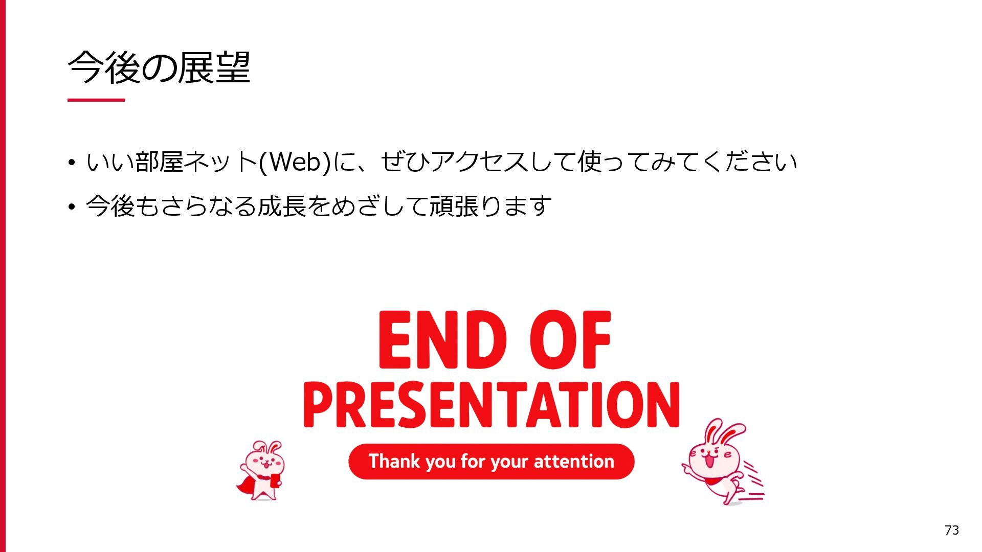 CDN を構築した結果、既存 CDN よりも費⽤対効果がよいものができた • エッジコンピューティングの利便性を痛感 ü ローコードで開発・運⽤ ü 処理の安定性も問題なし ü キャパシティプランニングもほぼ不要 • CDN を透過的に適⽤することが重要 ü アプリケーションにキャッシュ設定をよせる ことが1つの最適解だと考えている • 開発者が Amazon CloudFront を保守する 必要がほぼないので快適 • オリジンシールドや AWS WAF によって、 オリジンの負荷が軽減 物件画像 CDN の振り返り サイト CDN の振り返り