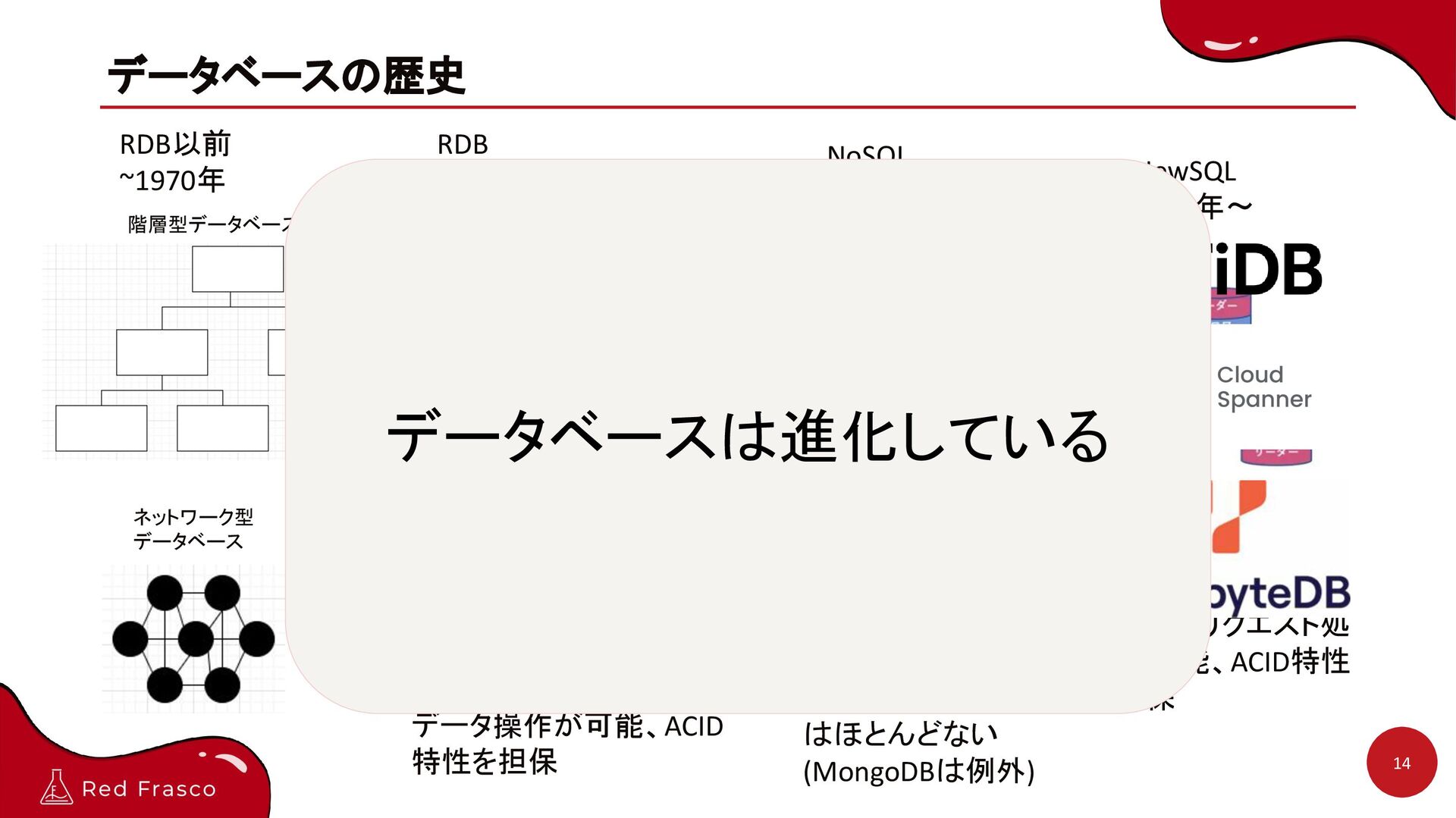 NoSQL 2000年〜 関係モデル(集合論と述 語論理)に基づいてSQLで データ操作が可能、ACID 特性を担保 GraphDB Key-Value NewSQL 2010年〜 大量リクエストの処 理が可能、ACID特性 はほとんどない (MongoDBは例外) 基本的なRDBの仕様 をある程度保持しつ つ、大量リクエスト処 理が可能、ACID特性 を担保 データベースは進化している