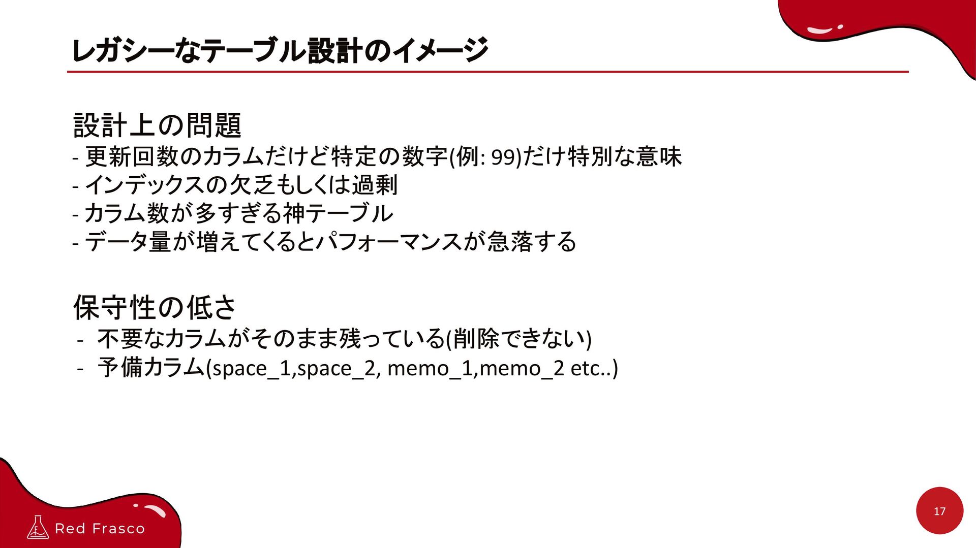 - データ量が増えてくるとパフォーマンスが急落する 保守性の低さ - 不要なカラムがそのまま残っている(削除できない) - 予備カラム(space_1,space_2, memo_1,memo_2 etc..)