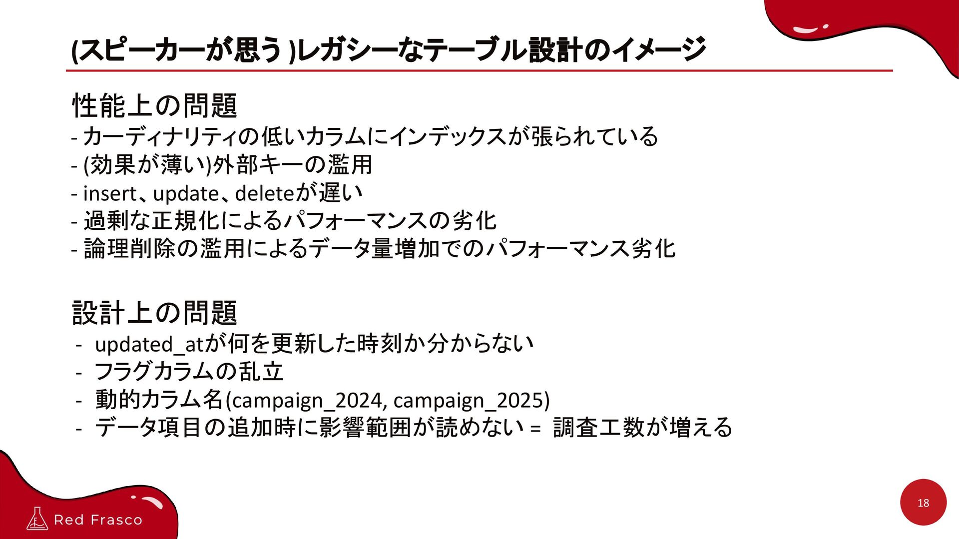 - 過剰な正規化によるパフォーマンスの劣化 - 論理削除の濫用によるデータ量増加でのパフォーマンス劣化 設計上の問題 - updated_atが何を更新した時刻か分からない - フラグカラムの乱立 - 動的カラム名(campaign_2024, campaign_2025) - データ項目の追加時に影響範囲が読めない = 調査工数が増える