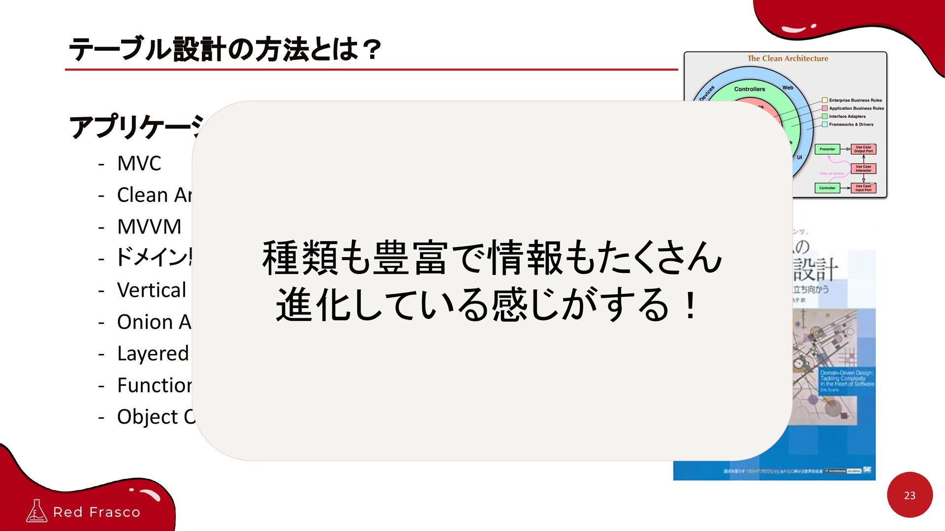 テーブル設計の方法とは? 23 アプリケーションコードは設 計方法が豊富 - MVC - Clean Architecture -