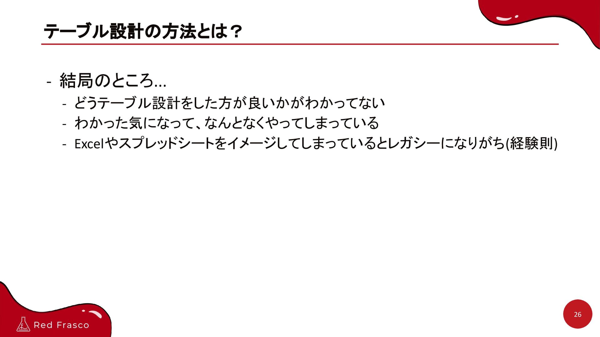 テーブル設計の方法とは? 26 - 結局のところ... - どうテーブル設計をした方が良いかがわかってない - わかった気になって、なんとなくやってしまっている - Excelやスプレッドシートをイメージしてしまっているとレガシーになりがち(経験則)