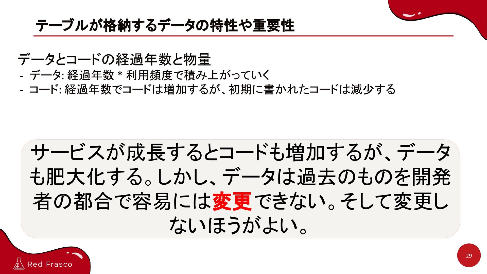 テーブルが格納するデータの特性や重要性 28 データとコードとライフタイム - データ: 数年〜数十年 - コード: 数カ月〜数年(短くなる傾向にある) データ