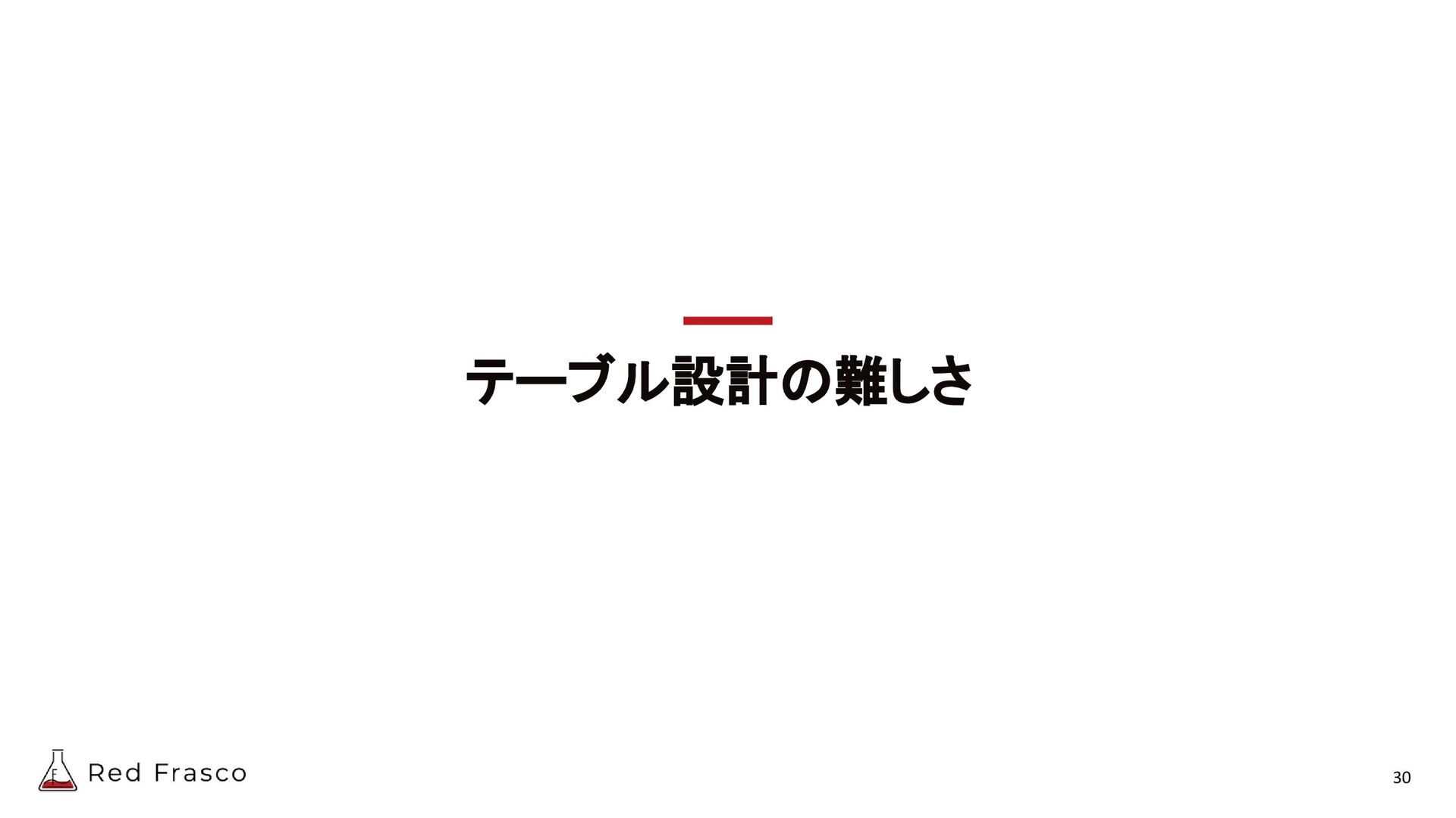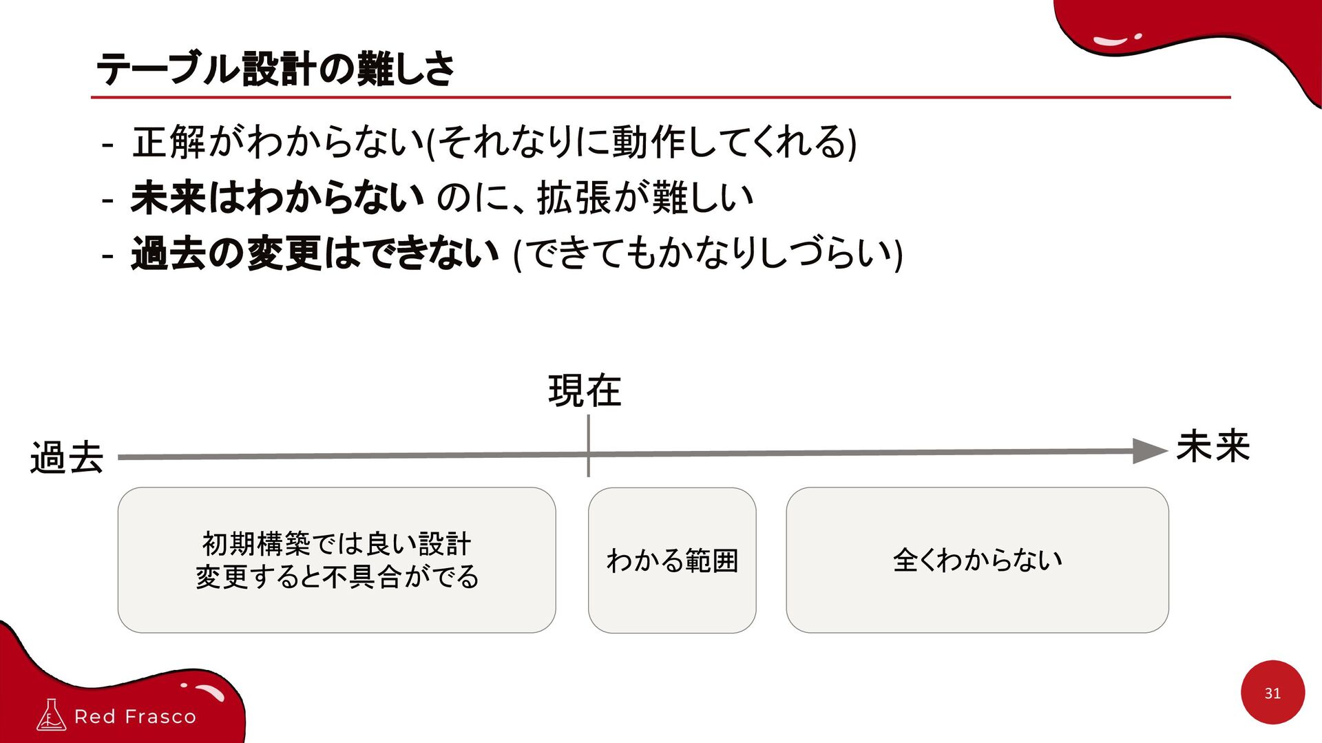 テーブル設計の難しさ - 正解がわからない(それなりに動作してくれる) - 未来はわからない のに、拡張が難しい - 過去の変更はできない (できてもかなりしづらい) 31