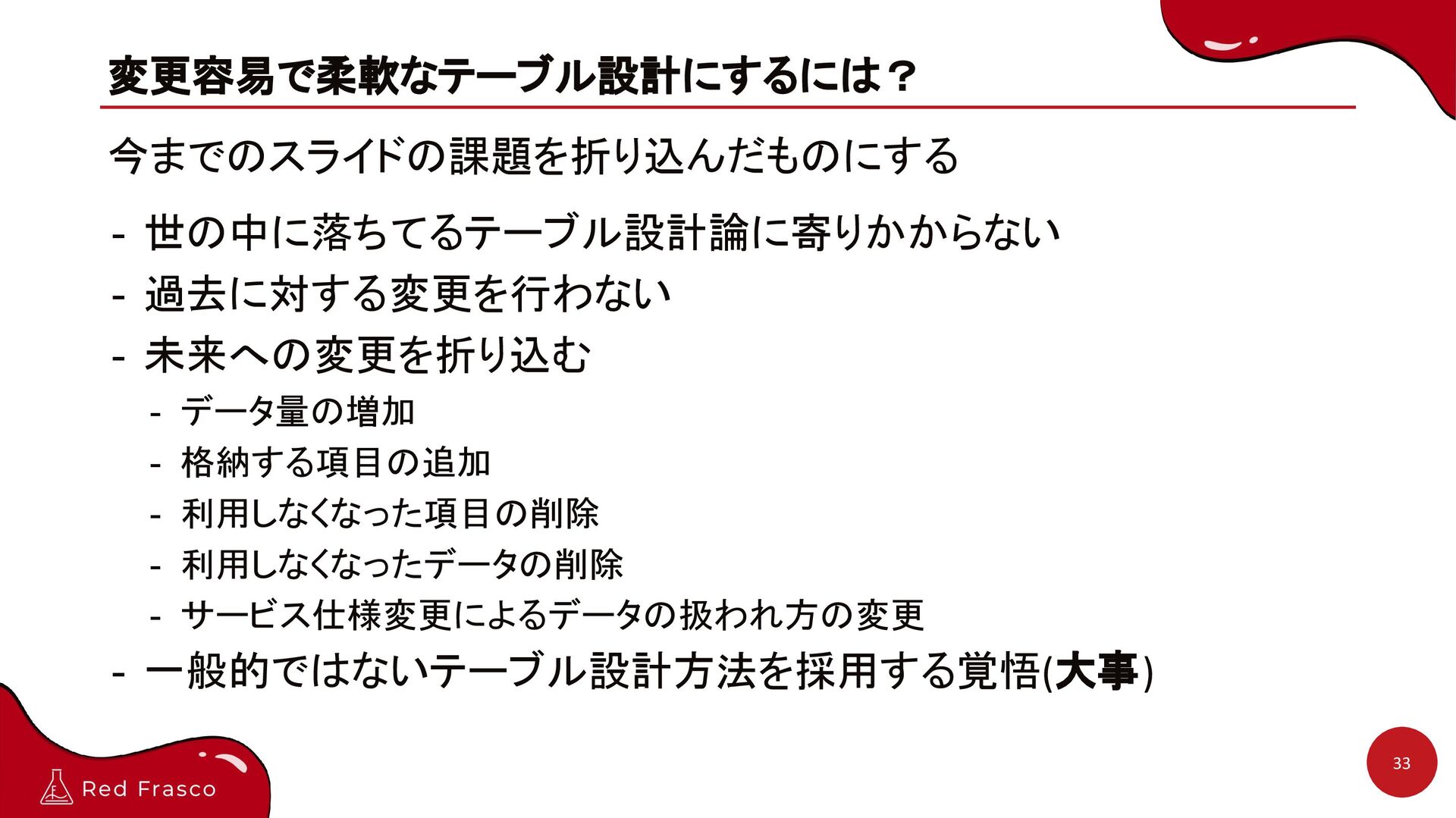 - 格納する項目の追加 - 利用しなくなった項目の削除 - 利用しなくなったデータの削除 - サービス仕様変更によるデータの扱われ方の変更 - 一般的ではないテーブル設計方法を採用する覚悟(大事) 33
