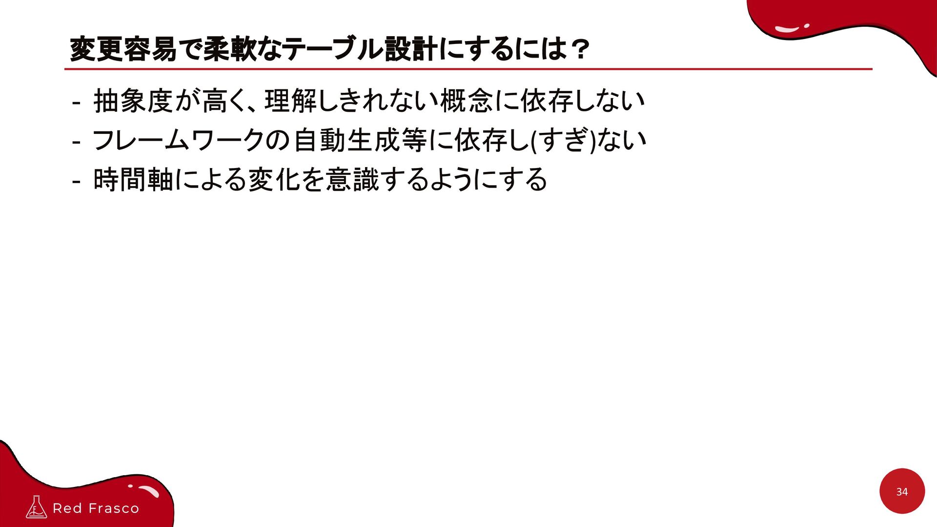変更容易で柔軟なテーブル設計にするには? - 抽象度が高く、理解しきれない概念に依存しない - フレームワークの自動生成等に依存し(すぎ)ない - 時間軸による変化を意識するようにする 34