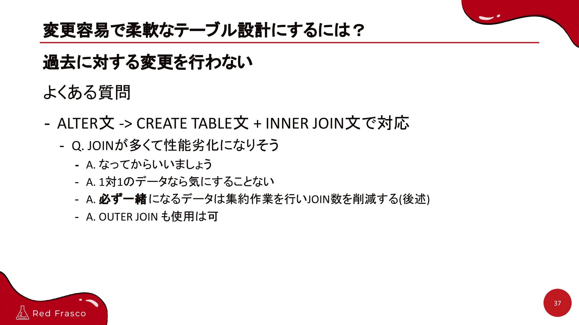 変更容易で柔軟なテーブル設計にするには? 過去に対する変更を行わない よくある質問 - ALTER文 -> CREATE TABLE文 + INNER