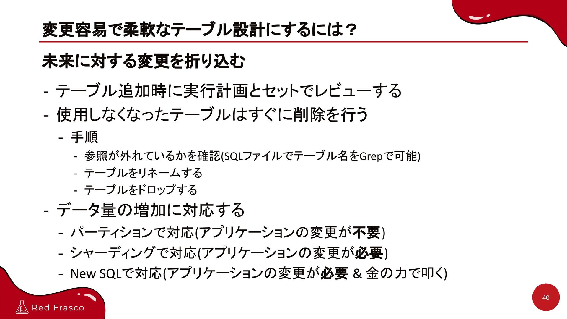 変更容易で柔軟なテーブル設計にするには? 未来に対する変更を折り込む - テーブル追加時に実行計画とセットでレビューする - 使用しなくなったテーブルはすぐに削除を行う - 手順 - 参照が外れているかを確認(SQLファイルでテーブル名をGrepで可能)