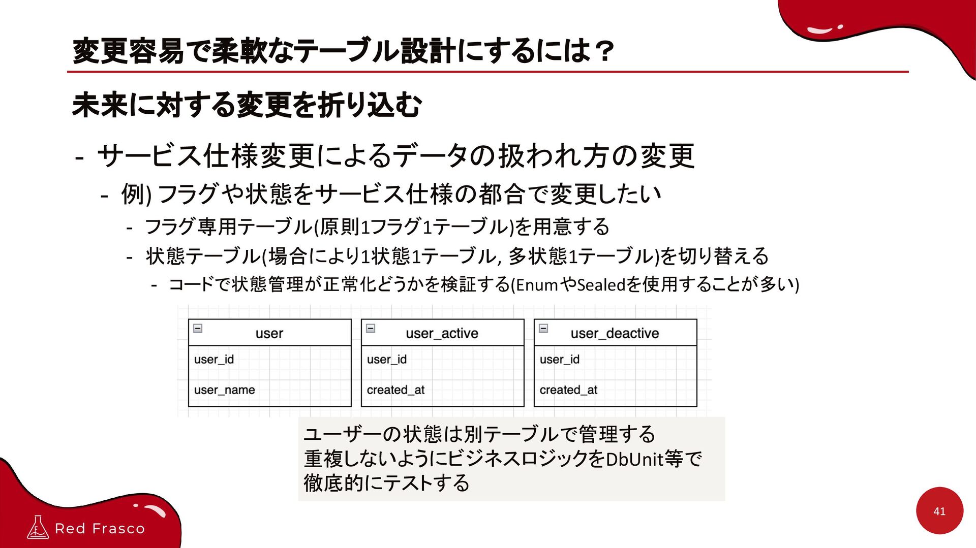 変更容易で柔軟なテーブル設計にするには? 未来に対する変更を折り込む - サービス仕様変更によるデータの扱われ方の変更 - 例) フラグや状態をサービス仕様の都合で変更したい - フラグ専用テーブル(原則1フラグ1テーブル)を用意する -