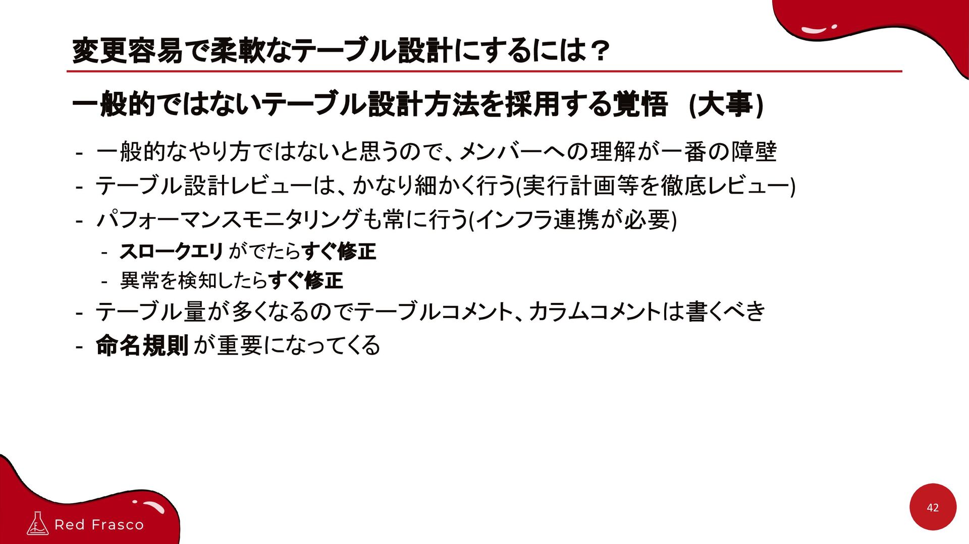 変更容易で柔軟なテーブル設計にするには? 一般的ではないテーブル設計方法を採用する覚悟 (大事) - 一般的なやり方ではないと思うので、メンバーへの理解が一番の障壁 - テーブル設計レビューは、かなり細かく行う(実行計画等を徹底レビュー) - パフォーマンスモニタリングも常に行う(インフラ連携が必要) -