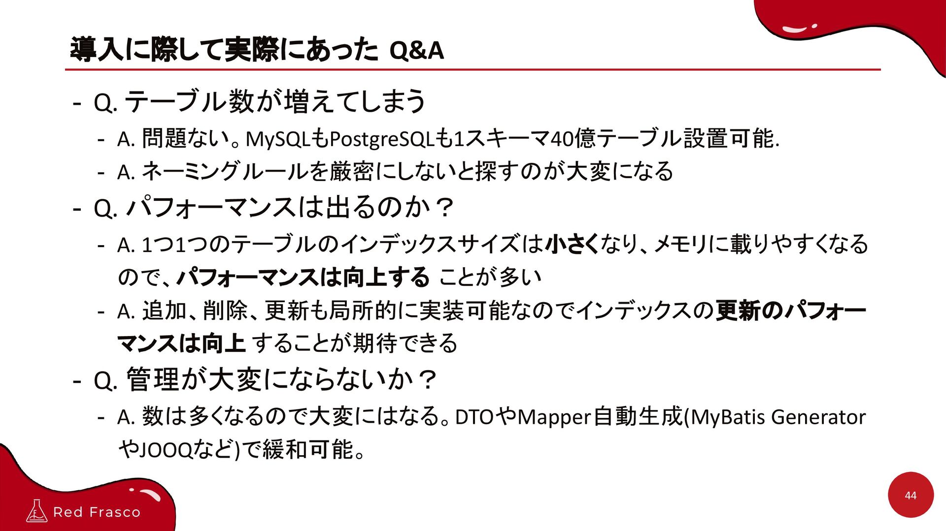 ネーミングルールを厳密にしないと探すのが大変になる - Q. パフォーマンスは出るのか? - A. 1つ1つのテーブルのインデックスサイズは小さくなり、メモリに載りやすくなる ので、パフォーマンスは向上する ことが多い - A. 追加、削除、更新も局所的に実装可能なのでインデックスの更新のパフォー マンスは向上 することが期待できる - Q. 管理が大変にならないか? - A. 数は多くなるので大変にはなる。DTOやMapper自動生成(MyBatis Generator やJOOQなど)で緩和可能。 44