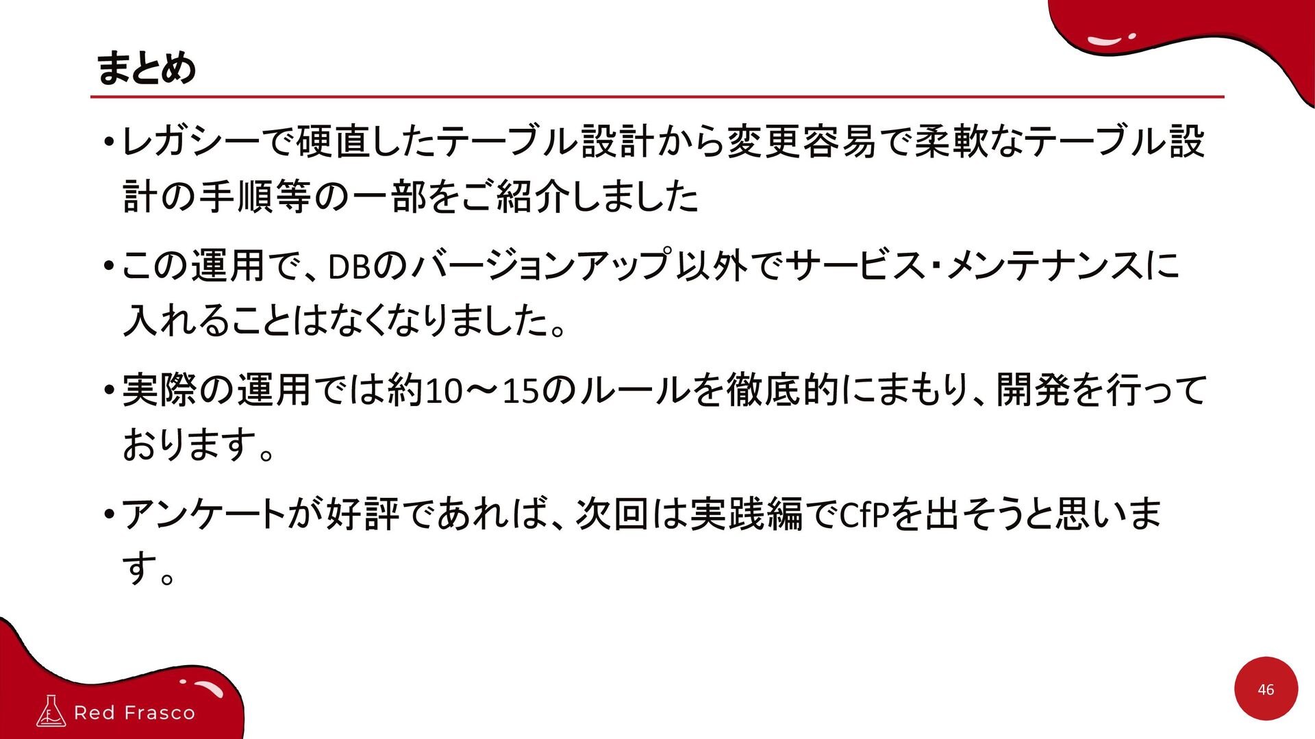 まとめ • レガシーで硬直したテーブル設計から変更容易で柔軟なテーブル設 計の手順等の一部をご紹介しました • この運用で、DBのバージョンアップ以外でサービス・メンテナンスに 入れることはなくなりました。 •実際の運用では約10〜15のルールを徹底的にまもり、開発を行って おります。 •アンケートが好評であれば、次回は実践編でCfPを出そうと思いま