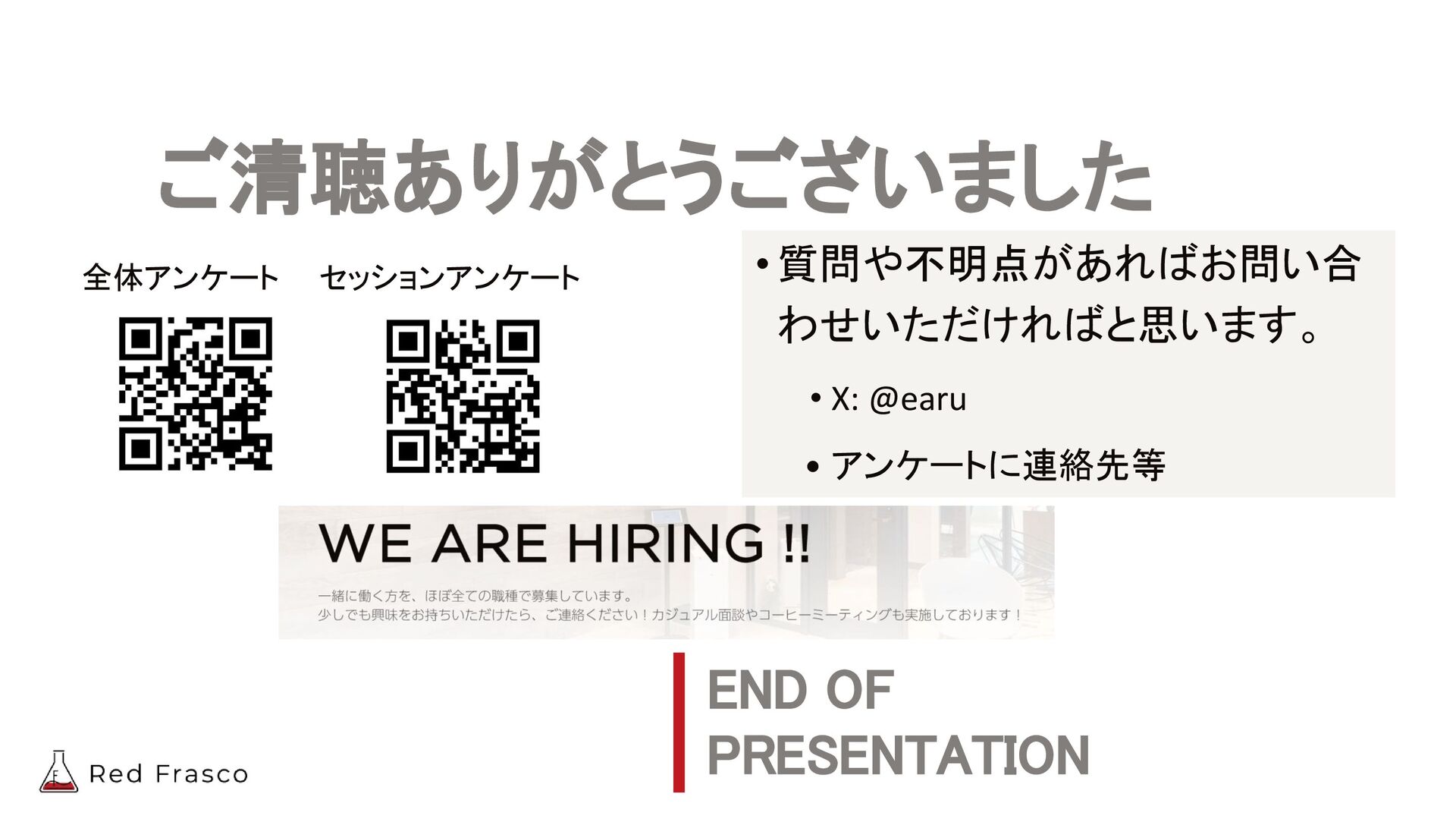 END OF PRESENTATION ご清聴ありがとうございました 全体アンケート セッションアンケート • 質問や不明点があればお問い合 わせいただければと思います。