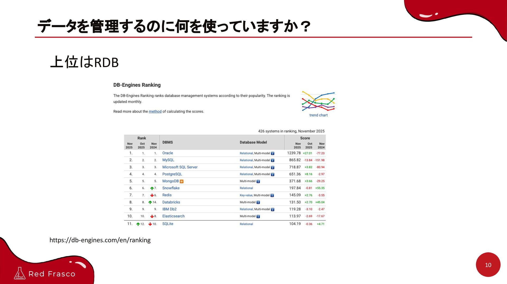 データを管理するのに何を使っていますか? 10 https://db-engines.com/en/ranking 上位はRDB